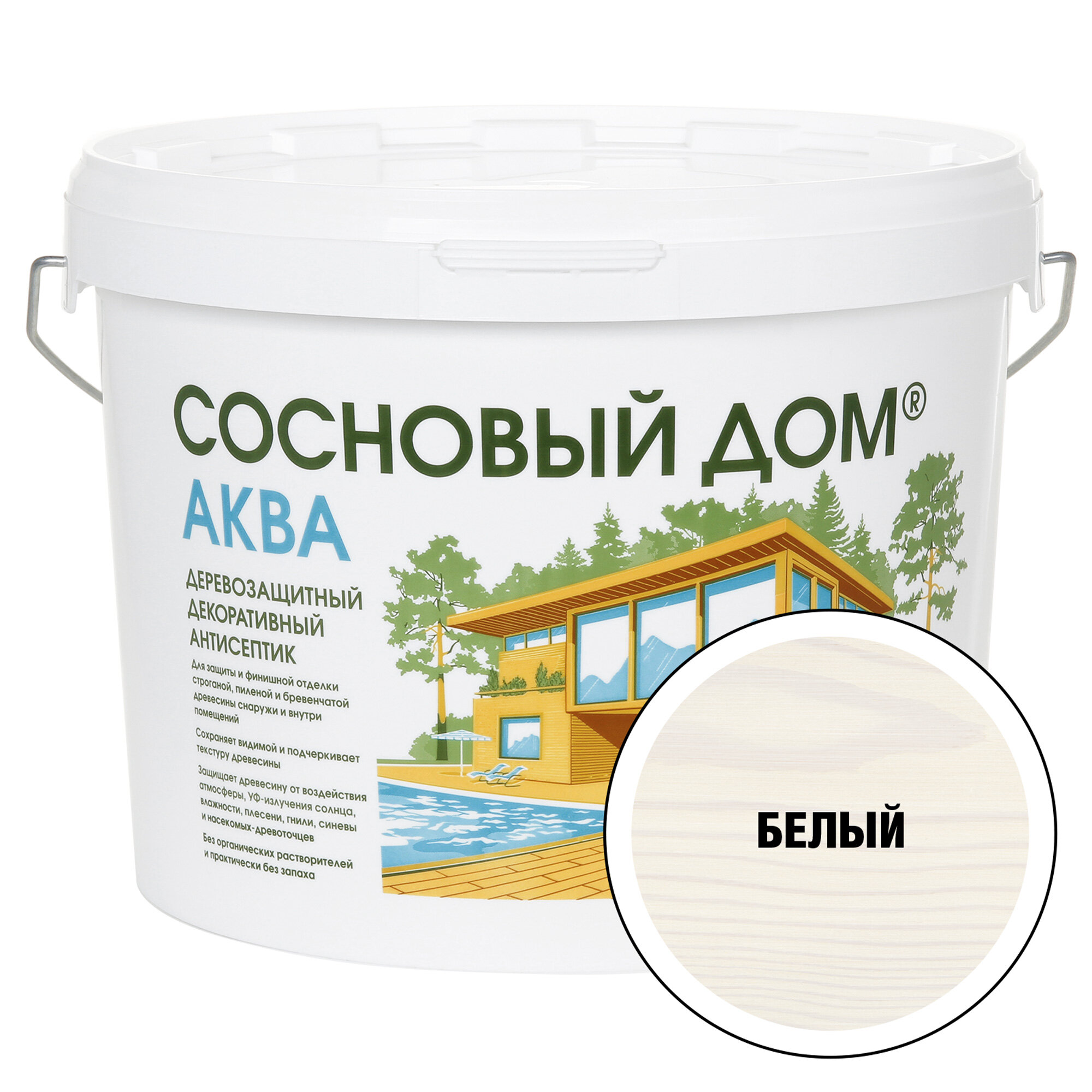 **Декоративный антисептик для дерева «Сосновый Дом» Аква** — лессирующий защитно-декоративный антисептик на акриловом связующем для финишной отделки строганой, пиленой и бревенчатой древесины снаружи и внутри помещений. Без органических растворителей и практически без запаха. Основная область применения — фасады деревянных зданий, стены и потолки внутри помещений, беседки, заборы, мебель, другие конструкции из строганой, пиленой и бревенчатой древесины. Страна производства — Россия.