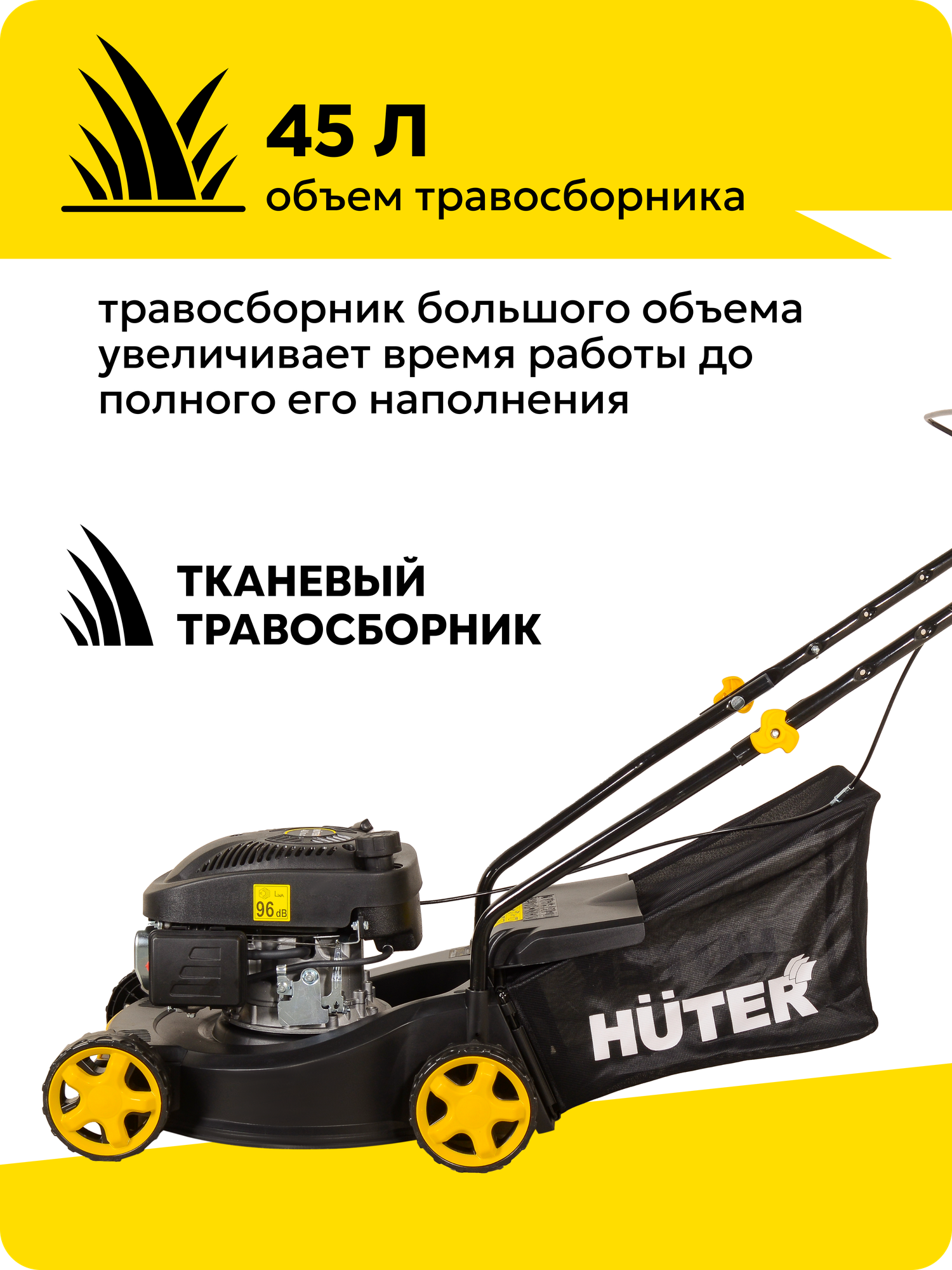 **Газонокосилка бензиновая Huter ** — самоходная модель для ухода за газоном на участках малой и средней площади. Отличается мощным двигателем, способна проходить по склонам и неровной поверхности. Централизованная регулировка высоты скашивания обеспечивает аккуратный рез.