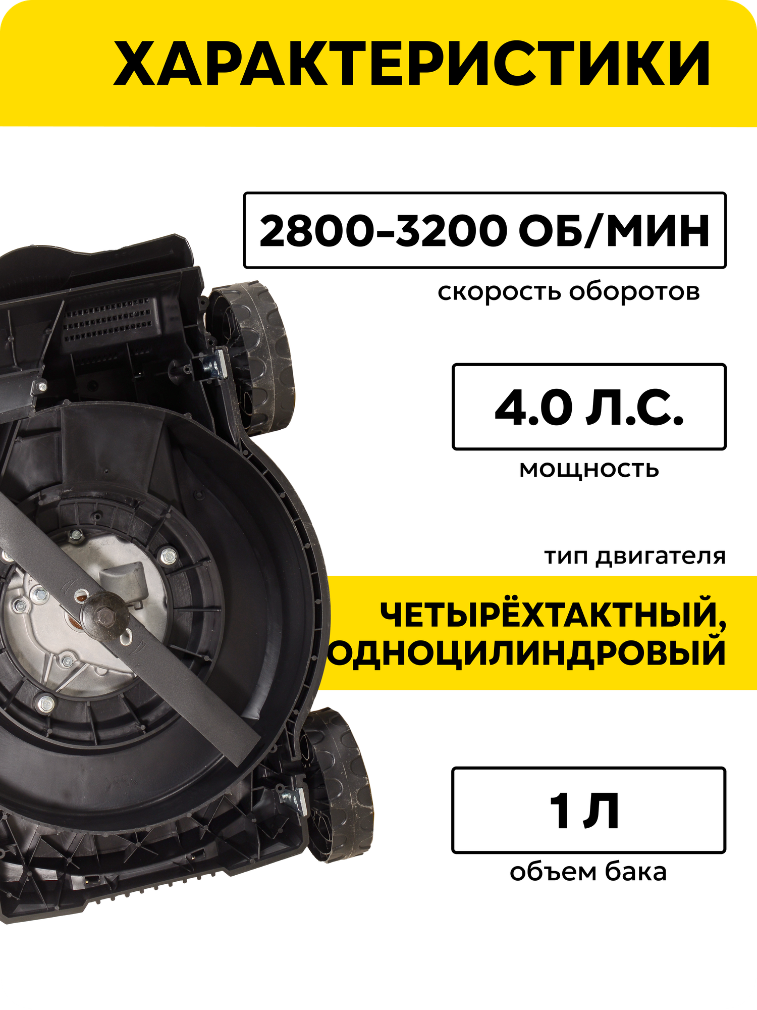 | Аксессуары в комплекте | ГазонокосилкаРукоятка управленияТравосборникКолесаНабор крепежаПаспортУпаковка |