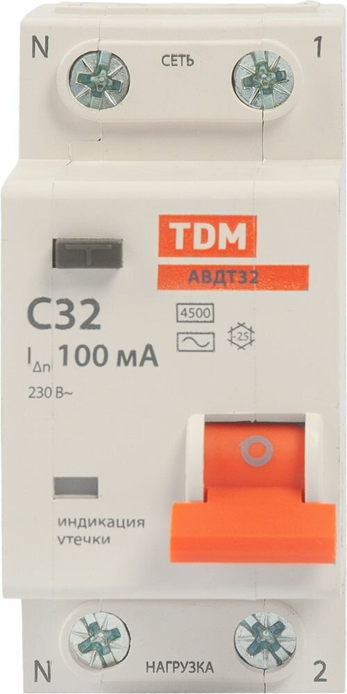 Дифференциальный автомат Tdm Electric 1P N C32 A 100 мА 4.5 кА AC SQ0202-0508 АВДТ-32