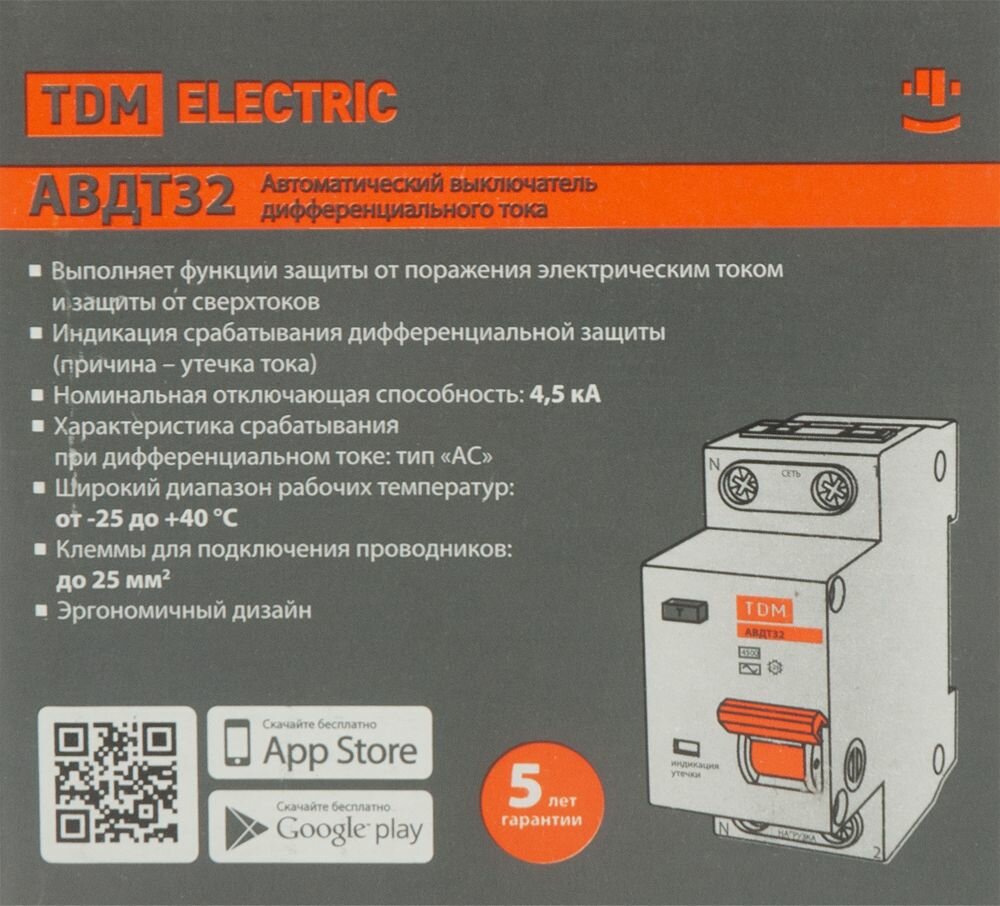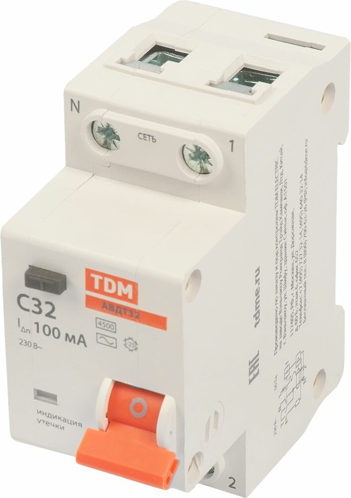 **Дифференциальный автомат TDM Electric 32 1Р N** предназначен для защиты электроцепей от короткого замыкания, токов перегрузки, защиты человека от токов утечки 100 мА. Обладает компактными габаритами, изготовлен из прочного, негорючего пластика.
