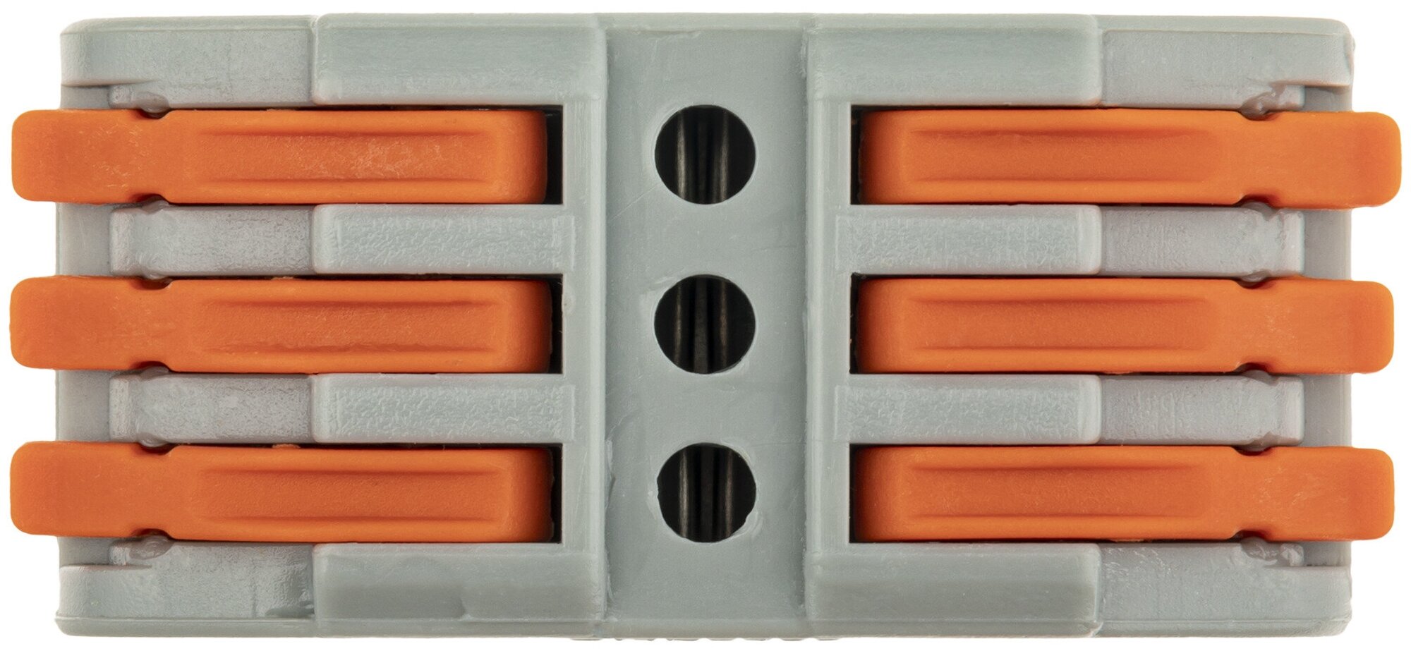 Рассчитана на 6 контактов, применяется при необходимости соединить многожильные проводники из меди, а также из сплавов меди и алюминия. Проходная клемма с рычажком находит свое применение при разводке электропроводки. Колодка соединительной клеммы выполнена из негорючего и изолирующего пластикового корпуса.