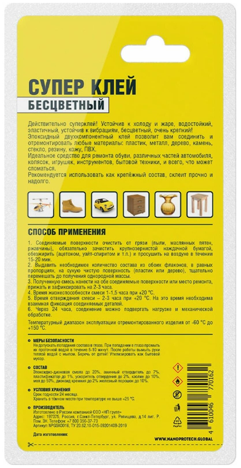 **Клей эпоксидный Nanoprotech** — двухкомпонентный прозрачный материал, в состав которого входит эпоксидная смола, отвердитель. Объем продукта составляет 10 г, упакован в пластиковый флакон. Предназначен для частичной или полной реставрации деталей, для ремонта и прочного соединения изделий.
