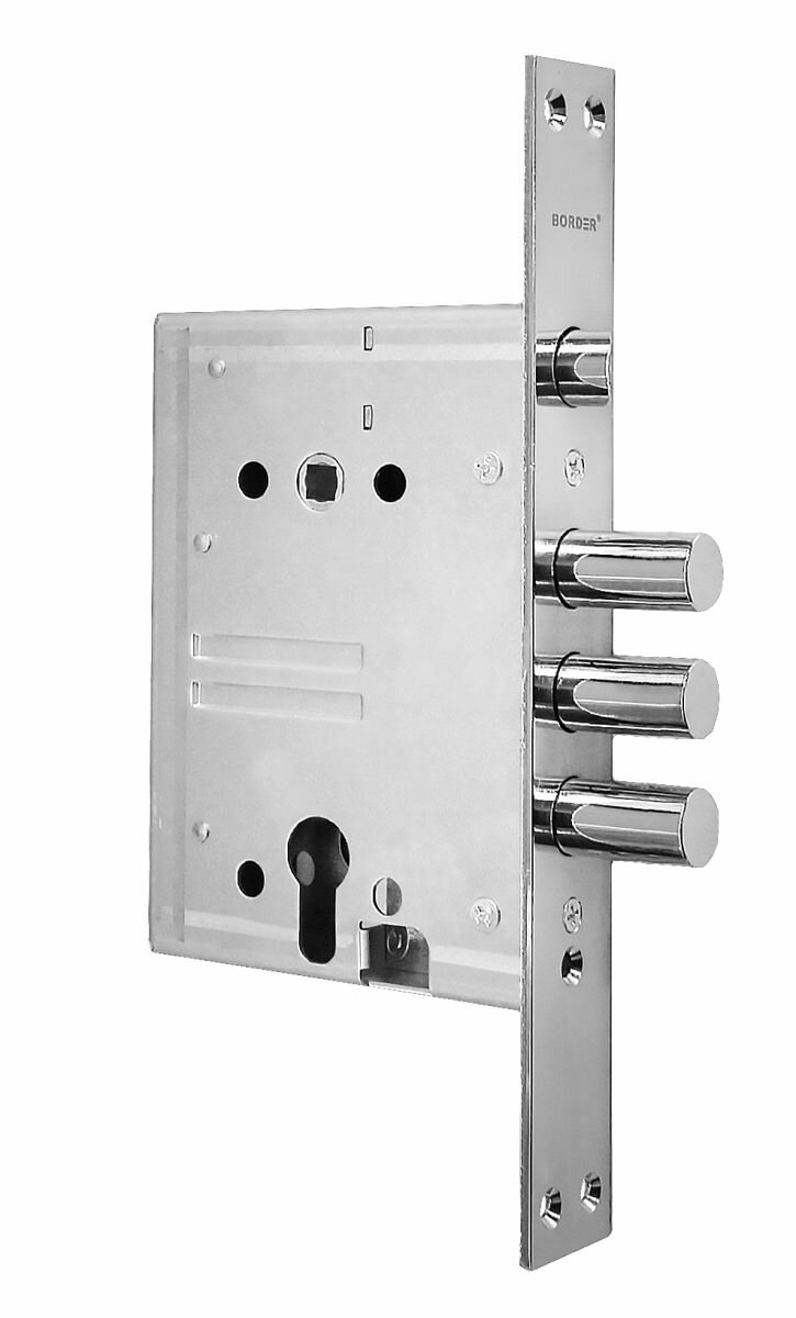 **Замок Border 79059-ЗВ4-3/85К** – универсальный врезной замок под цилиндр. Подходит для установки на металлические и деревянные двери. 3 цилиндрических ригеля и усиленная конструкция замка обеспечивают надежное запирание. Замок оснащен защитой от отмычек, высверливания, сворачивания.