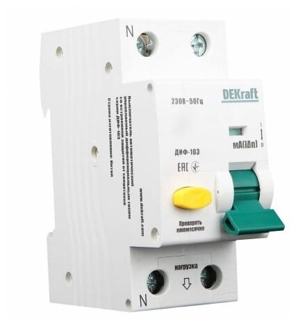 **Дифференциальный автомат DEKraft 1P N** предназначен для защиты электроцепей от короткого замыкания, токов перегрузки, защиты человека от токов утечки 30 мА. Обладает компактными габаритами, изготовлен из прочного, негорючего пластика. Дифференциальный автомат на 100% совместима с распределительными щитами Shneider Electric