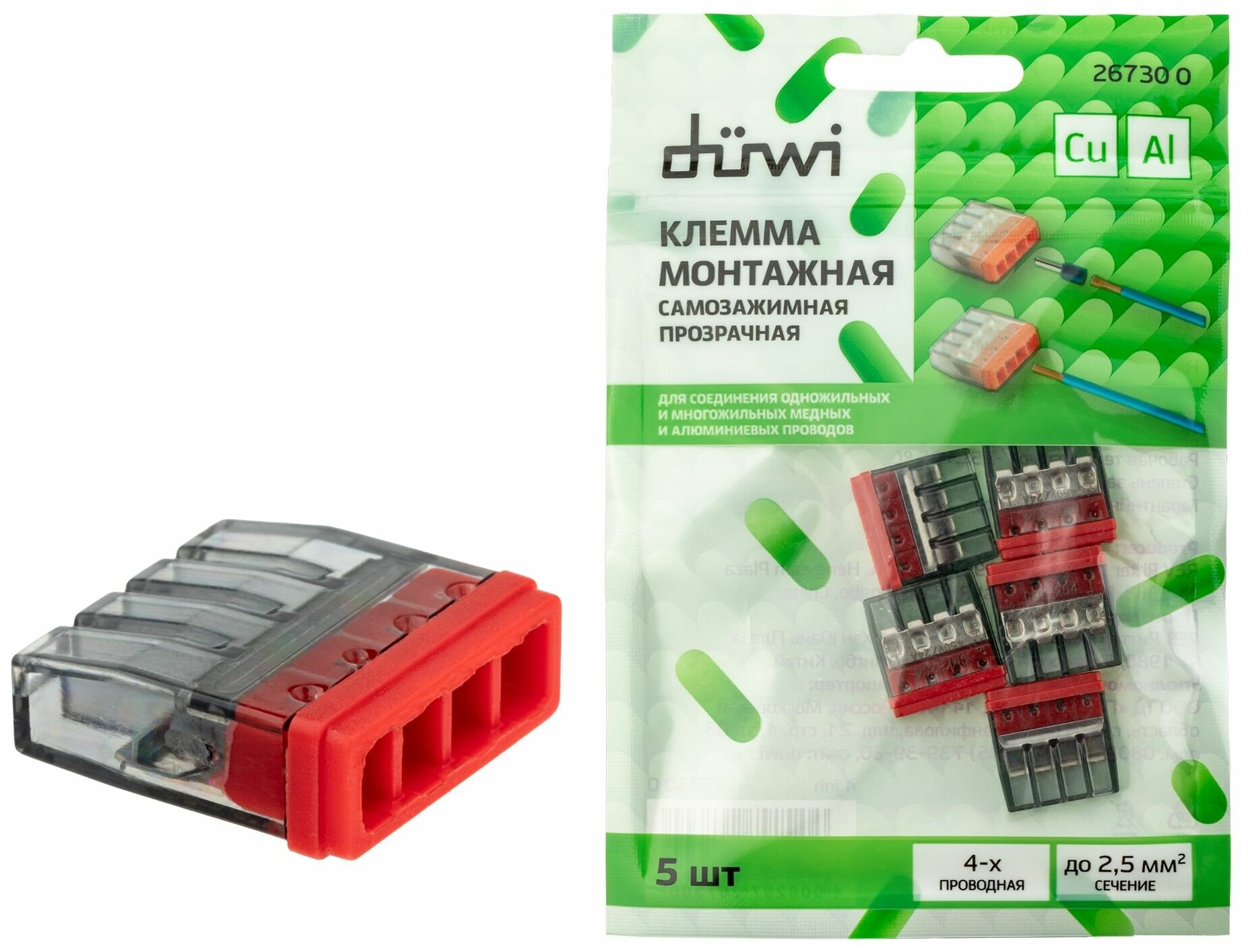 Клеммы монтажные самозажимные с пастой Duwi 4-проводные 25мм² прозрачные 5шт 26730 0 СМК 772-204