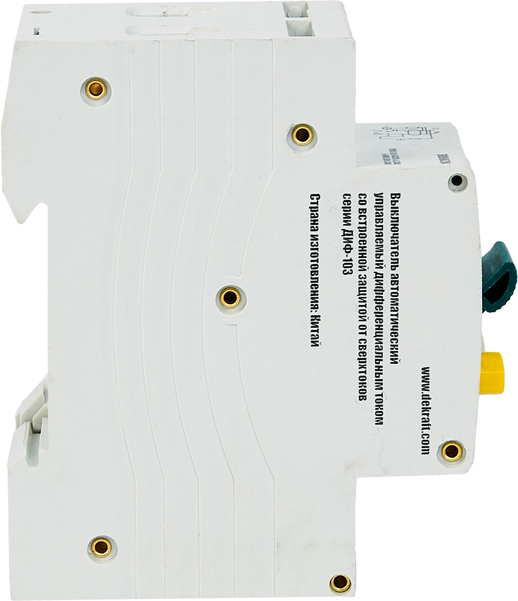 **Дифференциальный автомат DEKraft 1P N** предназначен для защиты электроцепей от короткого замыкания, токов перегрузки, защиты человека от токов утечки 30 мА. Обладает компактными габаритами, изготовлен из прочного, негорючего пластика. Дифференциальный автомат на 100% совместима с распределительными щитами Shneider Electric
