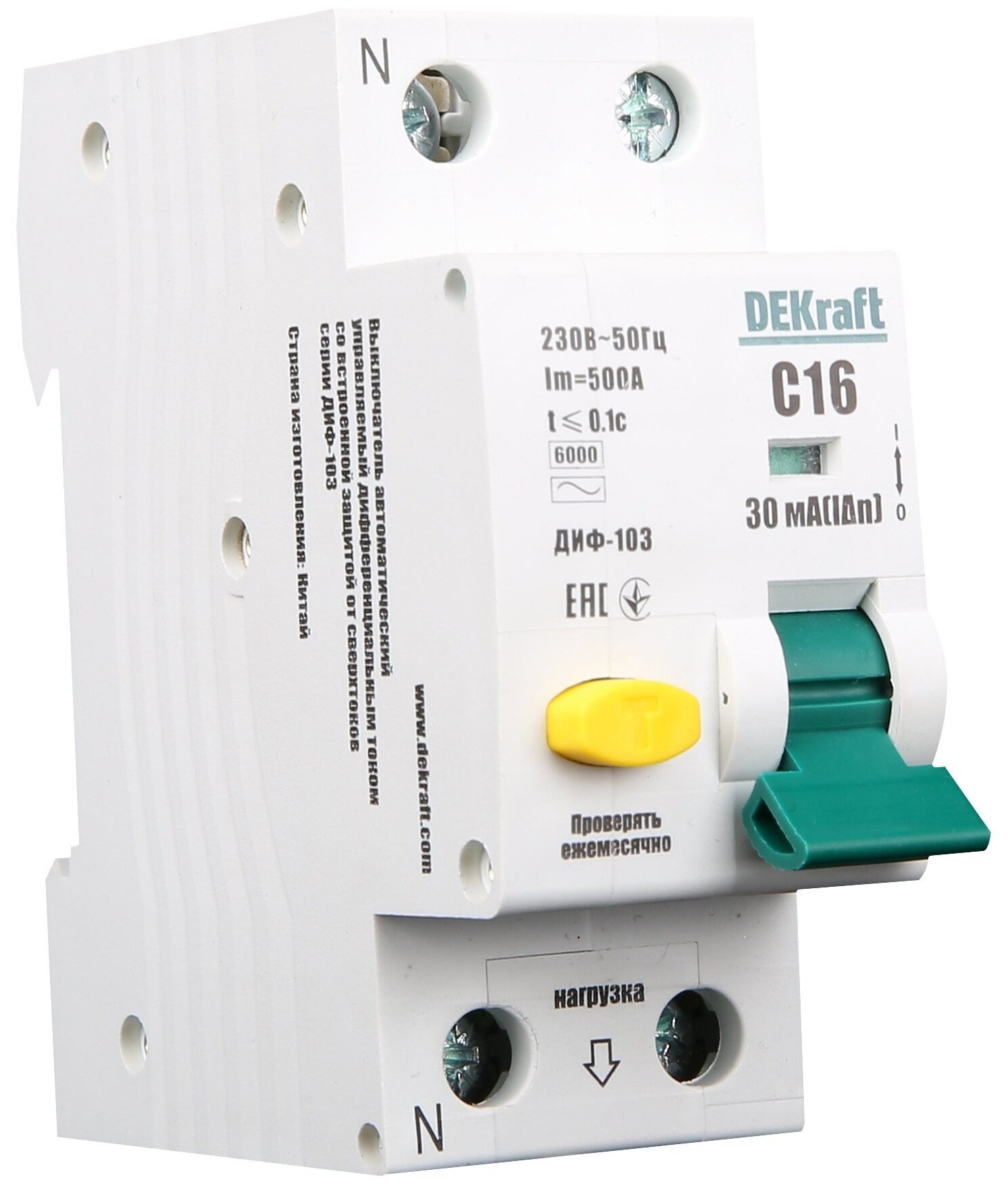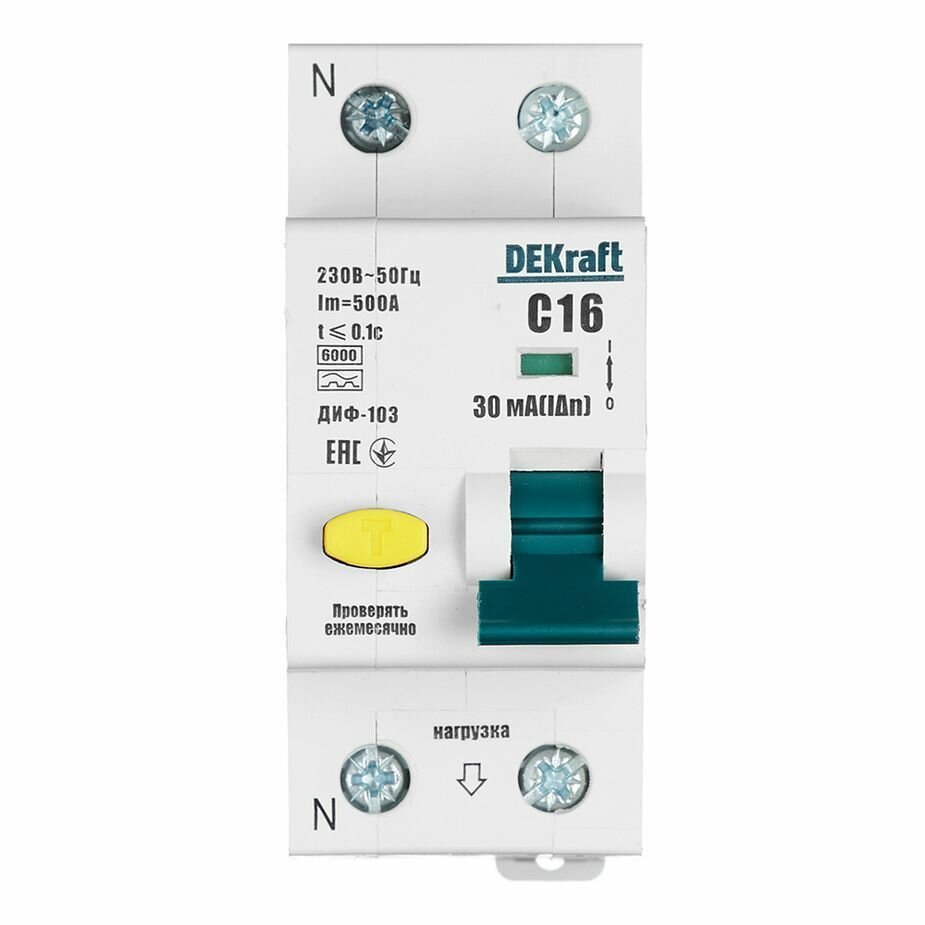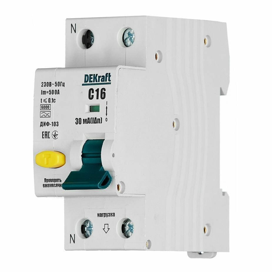 Дифференциальный автомат DEKraft 1P N C16 А 30 мА 6 кА A 16229DEK
