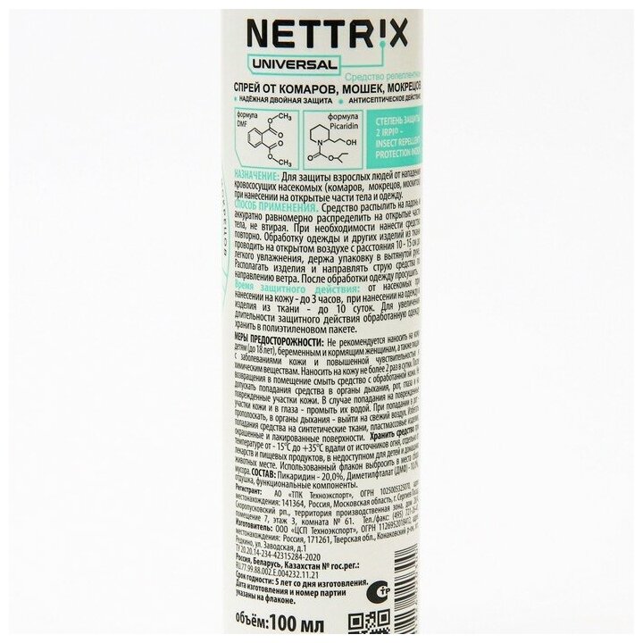 NETTRIX Universal Спрей от комаров, мошек, мокрецов - предназначен для защиты взрослых людей от комаров и других кровососущих насекомых. Можно наносить на тело и одежду. Содержит самый современный препарат Picardin - один из самых мощных и безопасных репеллентов. Держит атакующих комаров на расстоянии. Также аэрозоль обладает антисептическим действием, препятствует переносу комарами микробов и вирусов. Отлично подходит для отдыха на природе. **Применение:** 1. Средство распылить на ладонь и аккуратно равномерно распределить на открытые части тела, не втирая. 2. При необходимости нанести средство повторно. 3. Обработку одежды и других изделий из ткани проводить на открытом воздухе с расстояния 10 - 15 см до легкого увлажнения, держа упаковку в вытянутой руке. Располагать изделия и направлять струю средства по направлению ветра. После обработки одежду просушить. Время защитного действия: от насекомых при нанесении на кожу - до 3 часов, при нанесении на одежду и изделия из ткани - до 10 суток. Для увеличения длительности защитного действия обработанную одежду хранить в полиэтиленовом пакете. Меры предосторожности: 1. Не рекомендуется наносить на кожу детям (до 18 лет), беременным и кормящим женщинам, а также лицам с заболеваниями кожи и повышенной чувствительностью к химическим веществам. 2. Наносить на кожу не более 2 раз в сутки. После возвращения в помещение смыть средство с обработанной кожи.