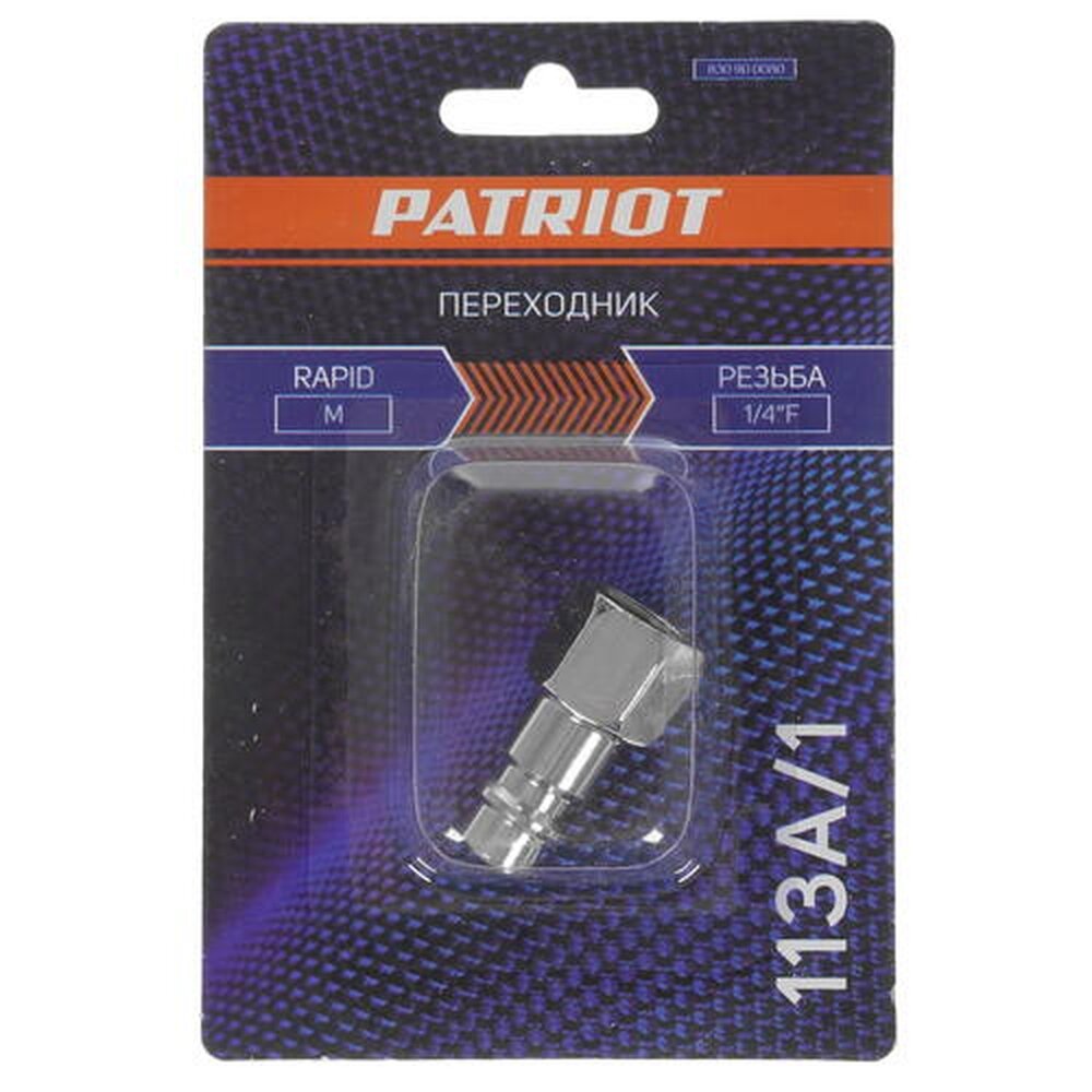 **Переходник Patriot 113А/1** предназначен для оснащения компрессора. Используется для перехода с штуцера рапид на резьбу 1/4 (M). Обеспечивает прочное и надежное соединение.