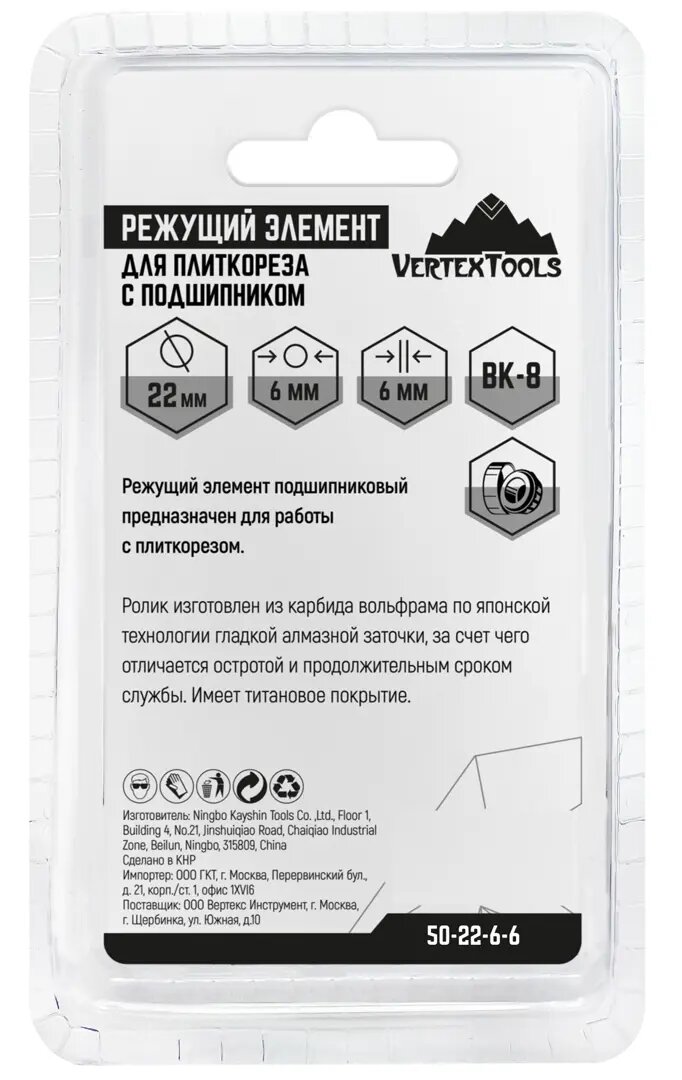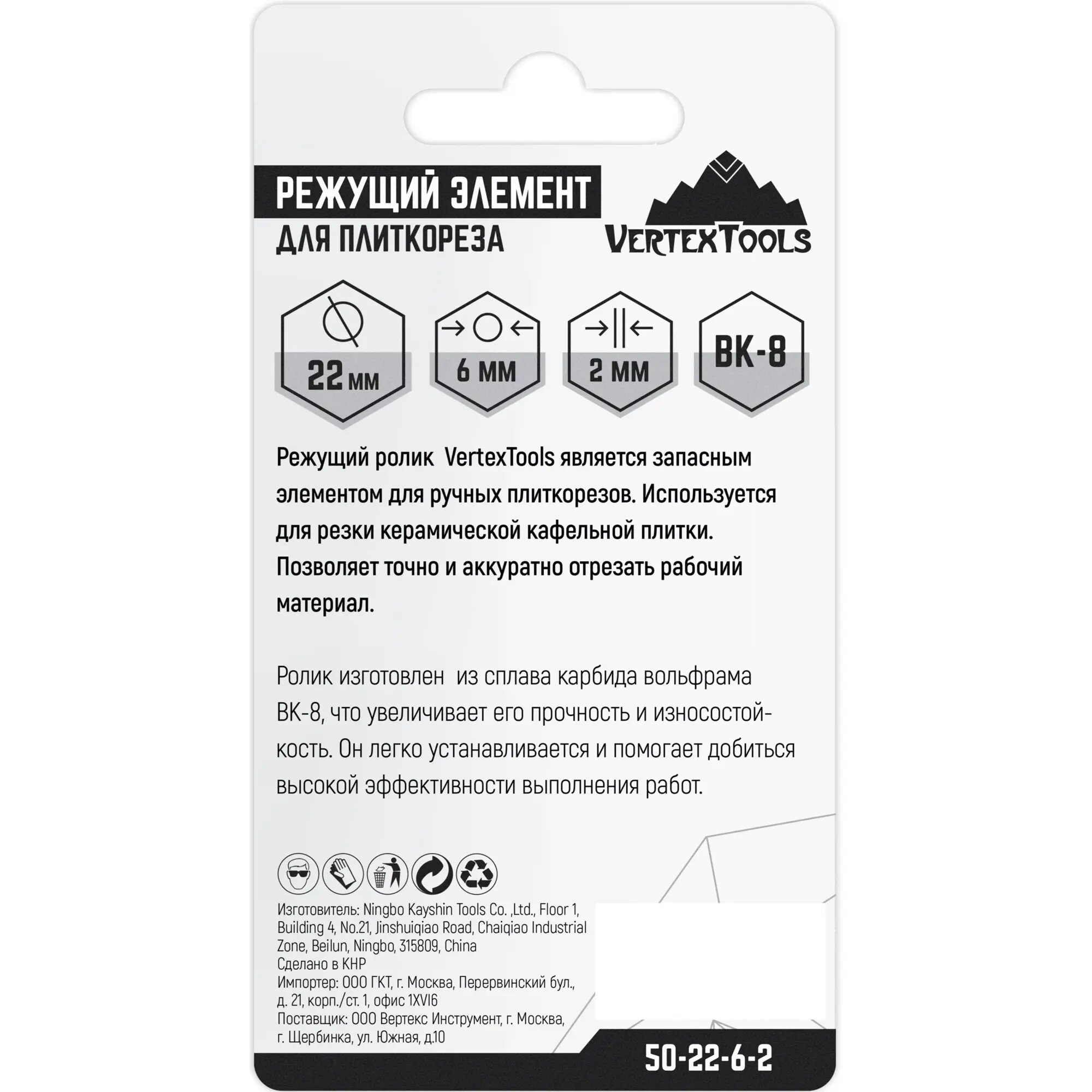 **Ролик для плиткореза Vertextools** — приспособление, которое используется для обработки керамической и кафельной плиток, керамогранита, стекла. Является сменным элементом. Позволяет аккуратно и максимально точно отрезать рабочий материал, обеспечив качественный результат при выполнении отделочных и прочих работ. Материалом для его изготовления служит сплав карбида вольфрама, который делает ролик прочным и износостойким.