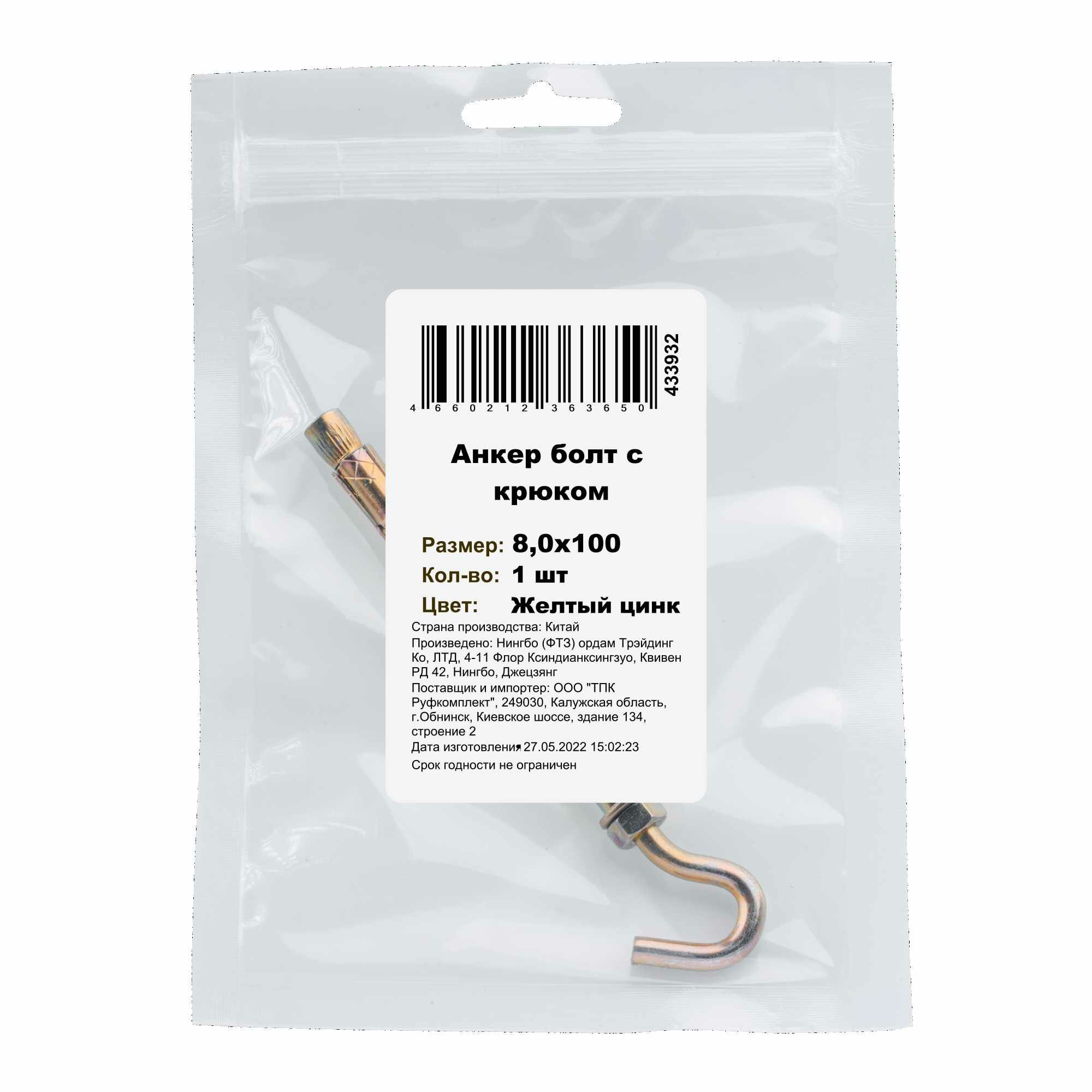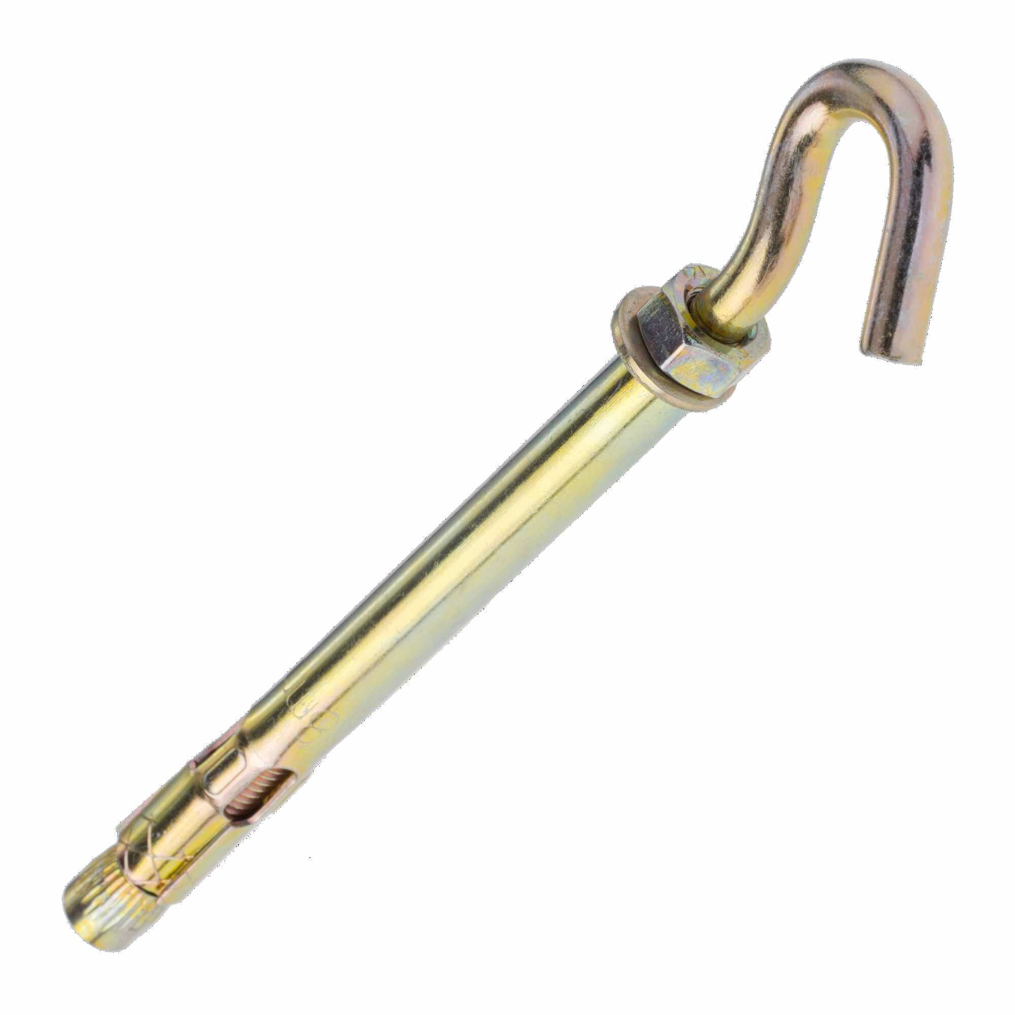 | Применение продукта | Анкерный болт с крюком (полукольцом) представляет собой крепежное изделие в виде стальной шпильки с гайкой и полукольцом на конце. Предназначен для крепления тяжелых съемных конструкций к основаниям из бетона, кирпича и т.п. |