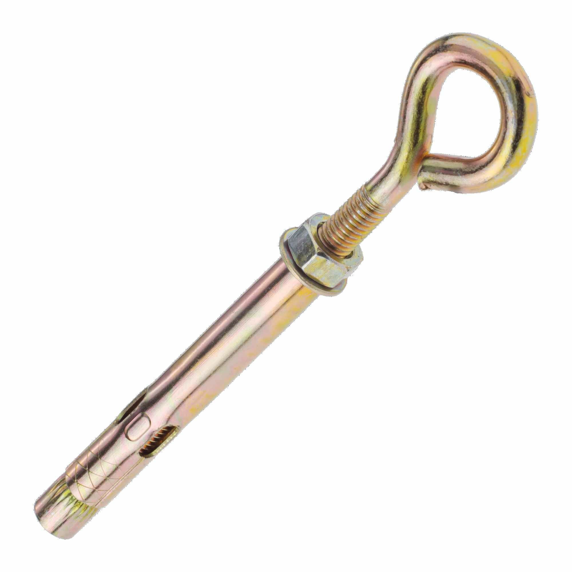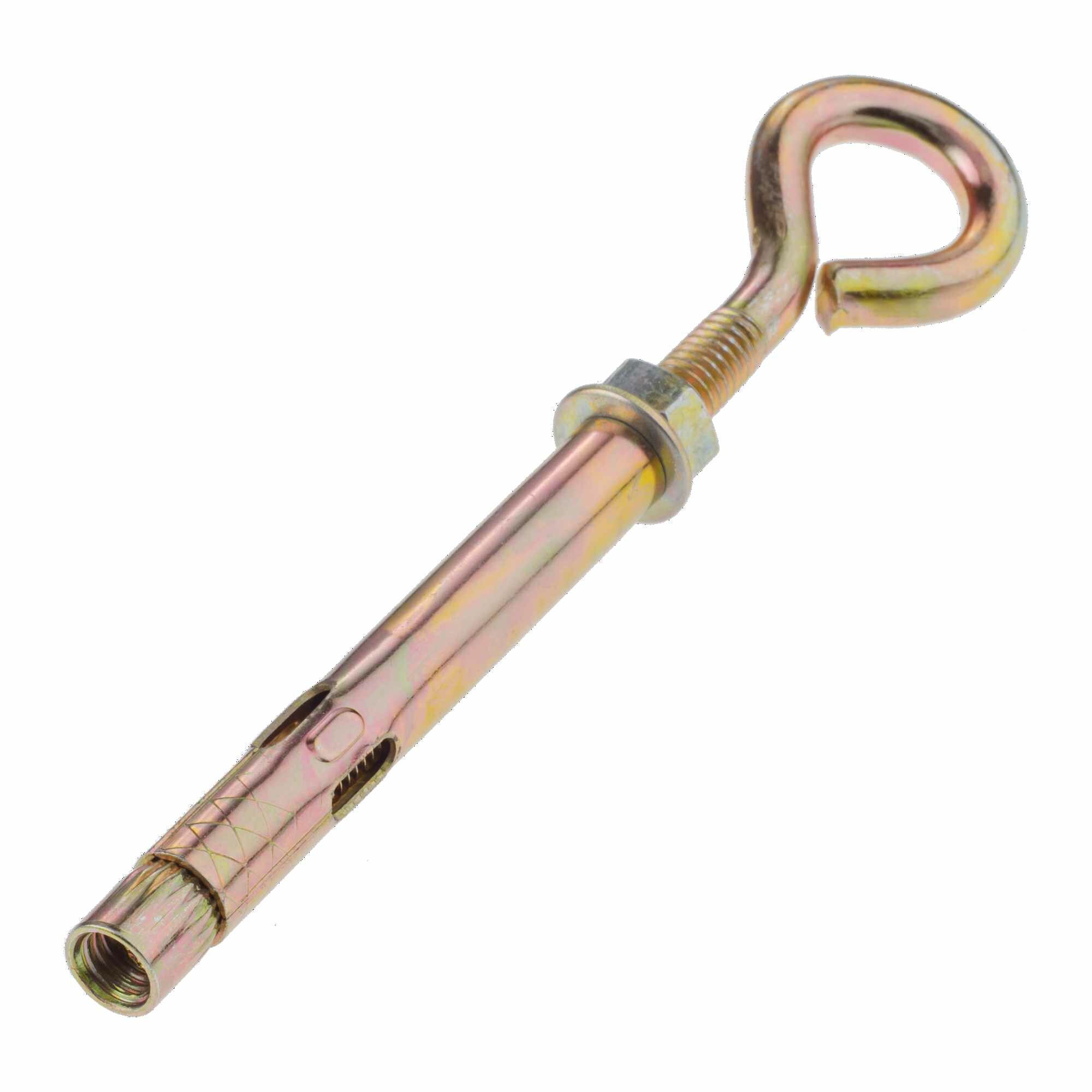 | Применение продукта | Анкер представляет собой крепежное изделие в виде стальной шпильки с гайкой и кольцом. Предназначен для крепления различных тяжеловесных конструкций, подвесных систем, крепления конструкций на растяжках в плотных строительных материалах. Устанавливается в предварительно просверленное отверстие. Крепится за счёт закручивания распорного элемента с кольцом. |