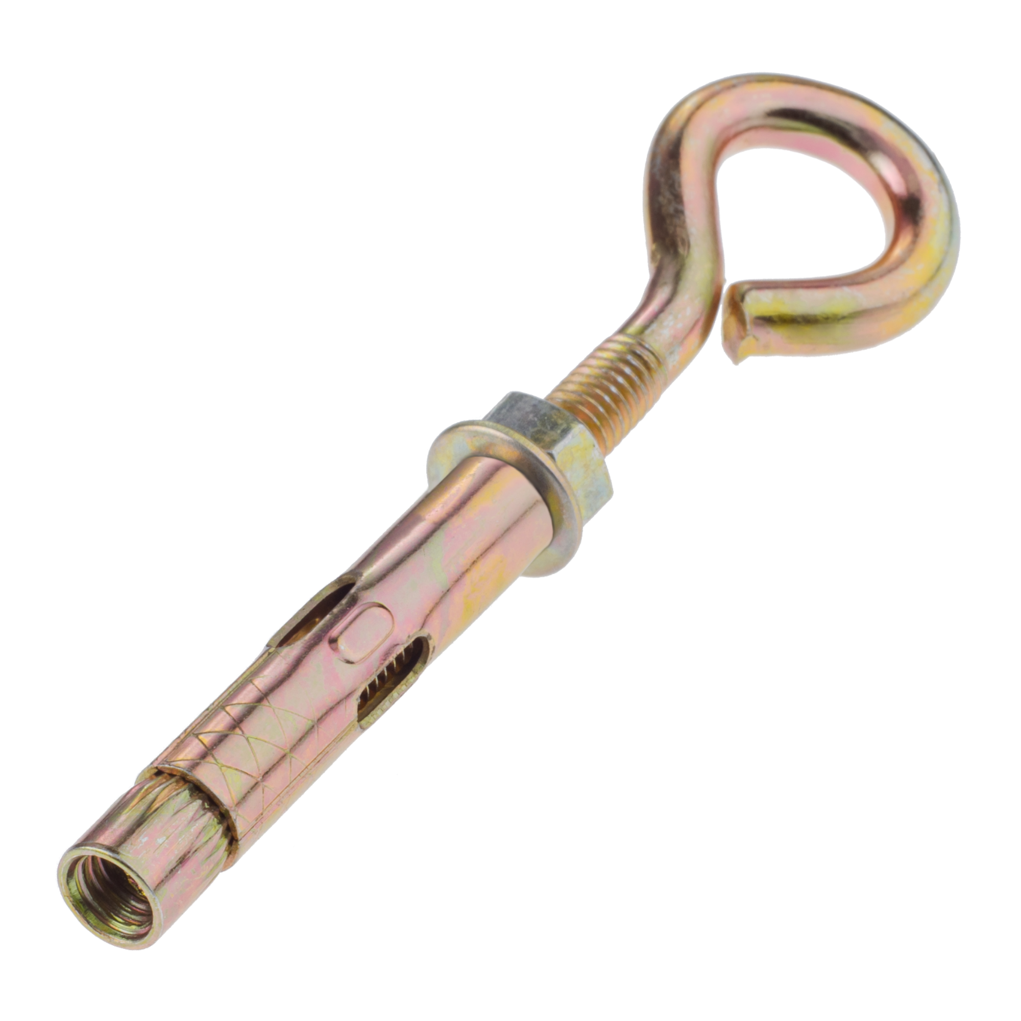 | Применение продукта | Анкер представляет собой крепежное изделие в виде стальной шпильки с гайкой и кольцом. Предназначен для крепления различных тяжеловесных конструкций, подвесных систем, крепления конструкций на растяжках в плотных строительных материалах. Устанавливается в предварительно просверленное отверстие. Крепится за счёт закручивания распорного элемента с кольцом. |