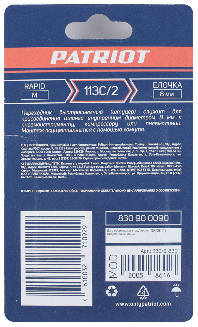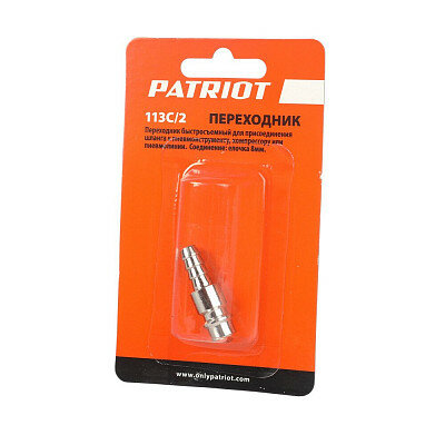 **Переходник Patriot 1260/2** предназначен для оснащения компрессора. Используется для перехода со штуцера рапид на штуцер елочка 8 мм. Обеспечивает прочное и надежное соединение.