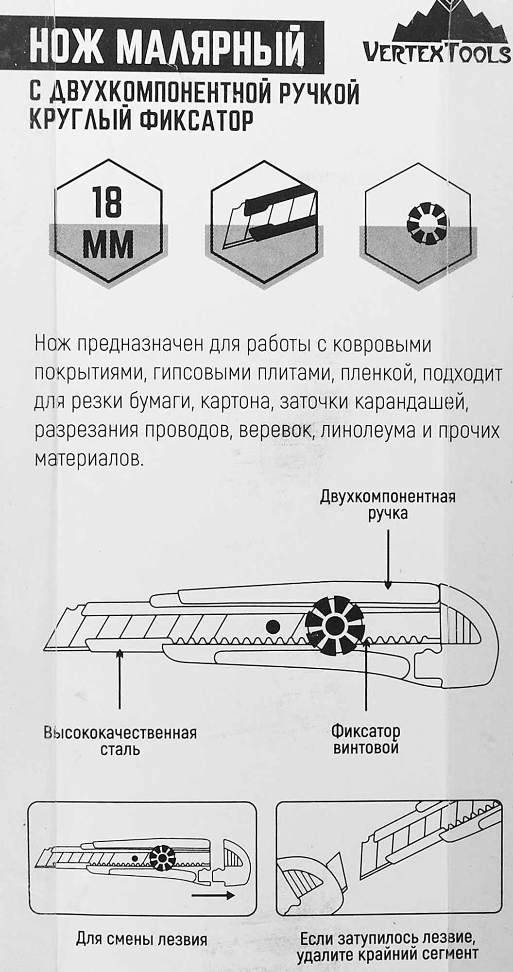 Нож строительный Vertextools 0044-100-18 двухкомпонентный корпус сегментное лезвие 18 мм Нож 18мм 2х комп.руч. с фиксатором
