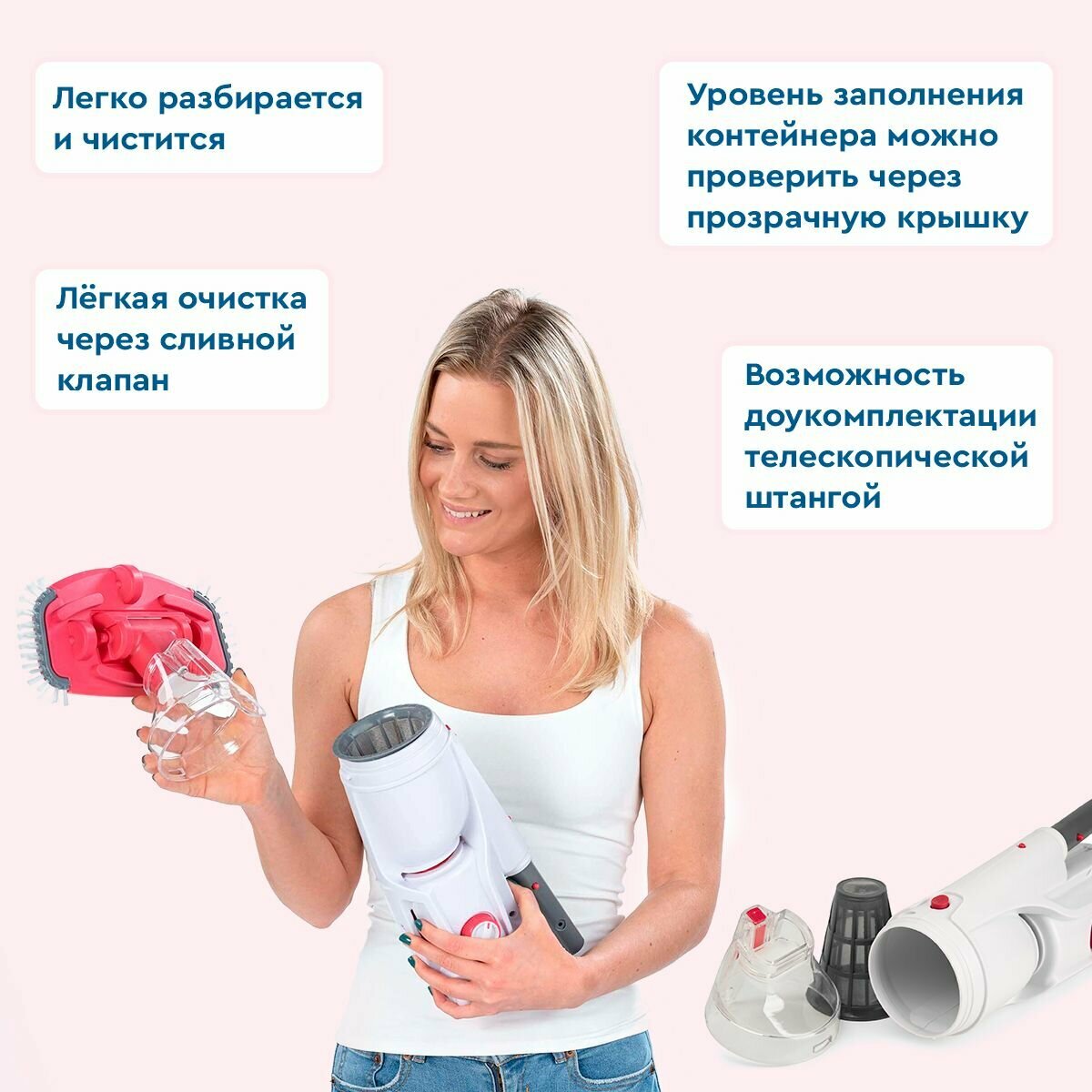 Пылесос работает от литий-ионного аккумулятора мощностью 4 Ач (7,4 В). Заряжается от USB, имеет автономность до 30 минут при полной зарядке аккумулятора. Для легкой и эффективной очистки пылесос оснащен большой поворотной всасывающей головкой с боковыми щетками для достижения труднодоступных углов, комбинацией фильтрующих вставок из нержавеющей стали разной микронности, плоской щеткой и клапаном быстрого слива. Укомплектован дополнительной насадкой для использования в СПА-салонах. Корпус изготовлен из прочного пластика и оснащен водонепроницаемым магнитным переключателем и светодиодным индикатором заряда. Пылесос легко чистить, промыв водой сетку и просушив её.