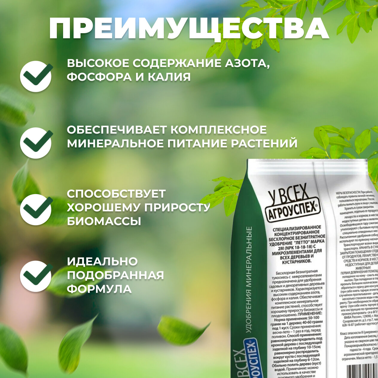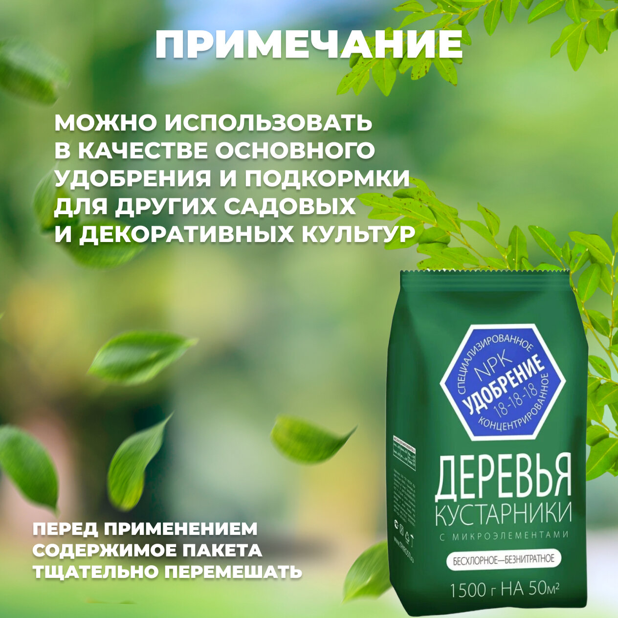 **Удобрение для деревьев и кустарников** не содержит нитратов и хлора. Порошок используются для приготовления раствора, который применяют для полива или опрыскивания. Относится к классу умеренно опасных веществ. Инструкция по использованию размещена на обороте.