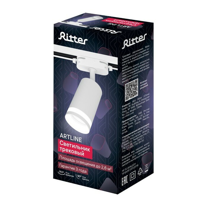 Трековый светильник поставляется в брендовой упаковке Ritter в комплекте с паспортом изделия; лампы в комплект не входят.