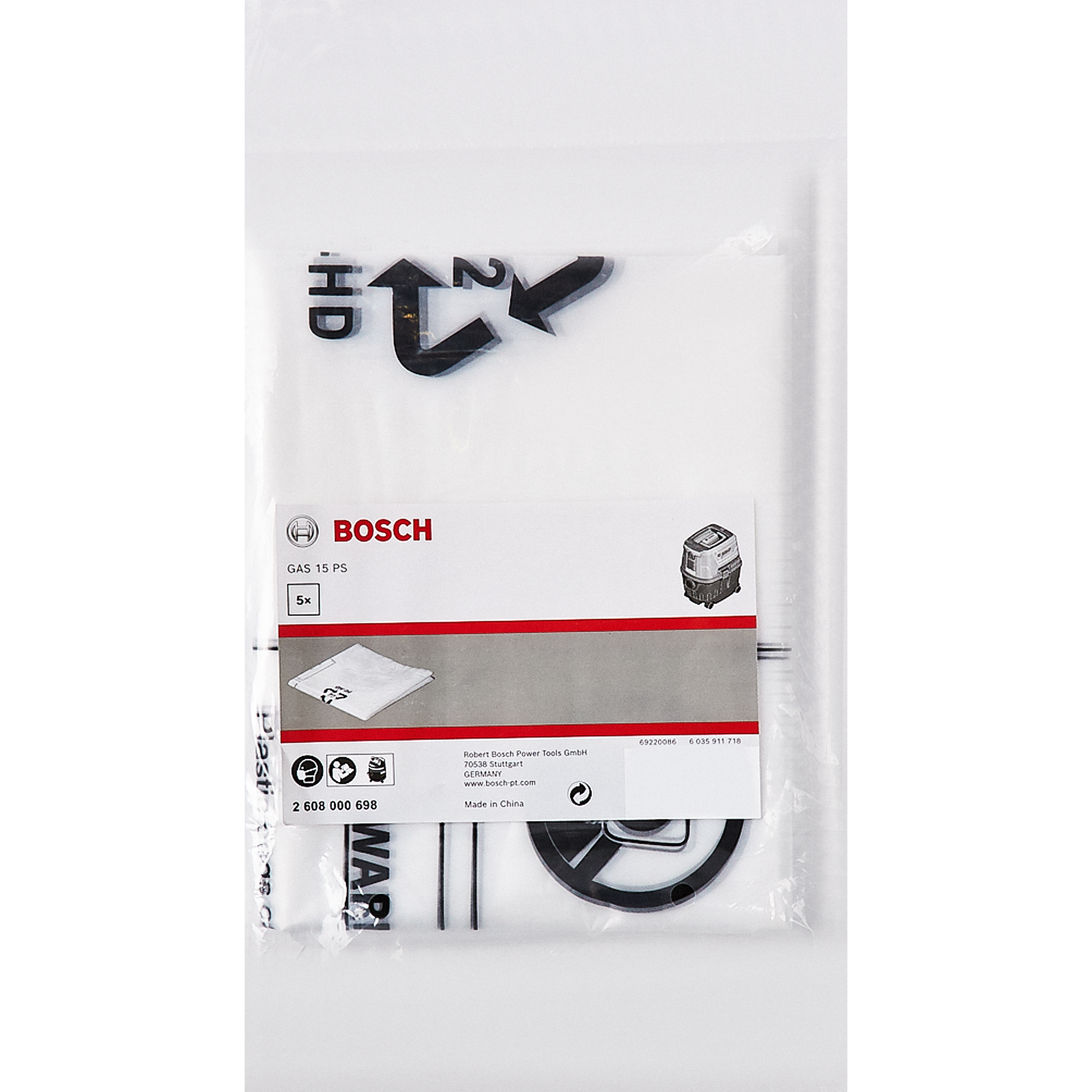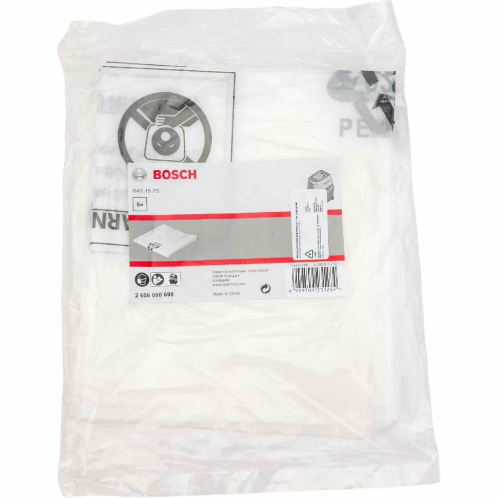 **Мешки для пылесоса GAS 15** изготовлены из полиэтилена. Предназначены для пылесоса Bosch Gas 15 PS Professional. Подходят для разного типа мусора (бытового, уличного, строительного), могут использоваться при сухой и влажной уборке. Мешки одноразовые. Прочные на разрыв. Продаются по 5 шт. Вместимость одного мешка — 5 л.