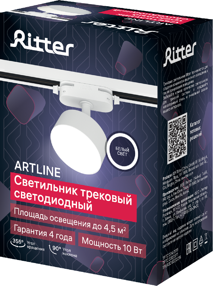 Трековый светильник поставляется в брендовой упаковке Ritter в комплекте с паспортом изделия.