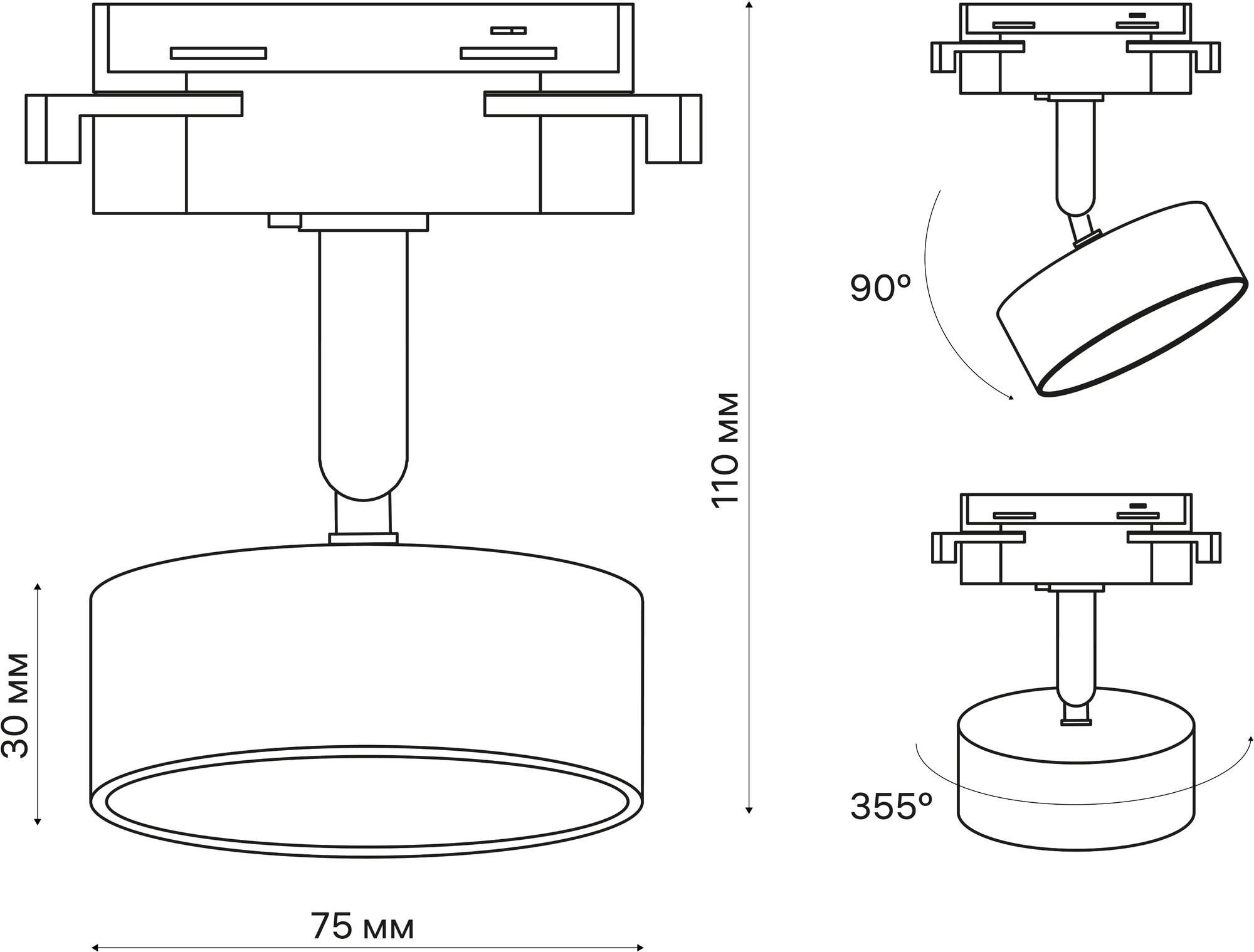 Поворотно-наклонная система трекового светильника позволяет плафону вращаться по окружности на 355°, а также изменять угол наклона до 90°.