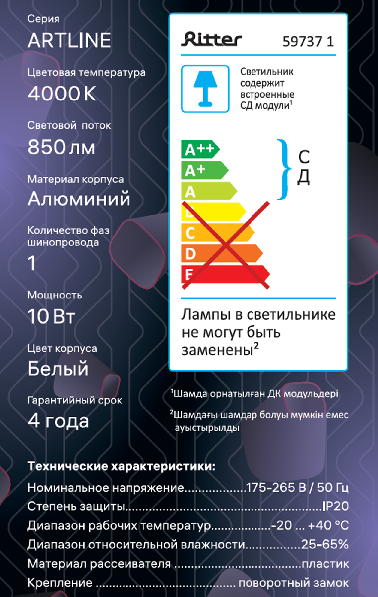 **Трековый светильник Ritter Artline** — предназначен для освещения жилых комнат и помещений общего пользования.