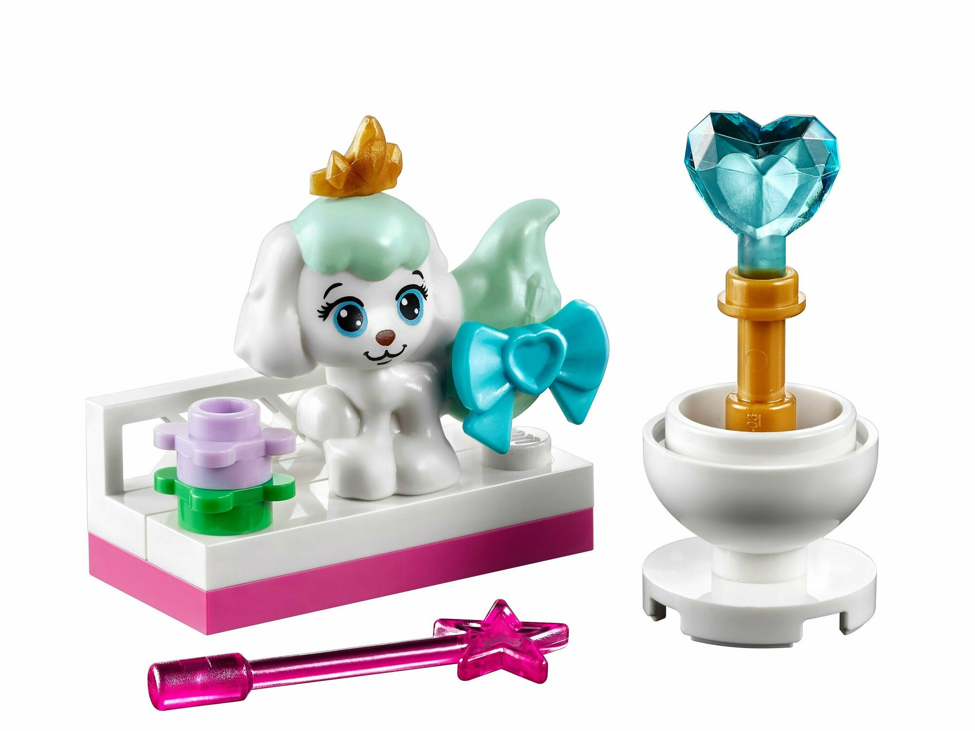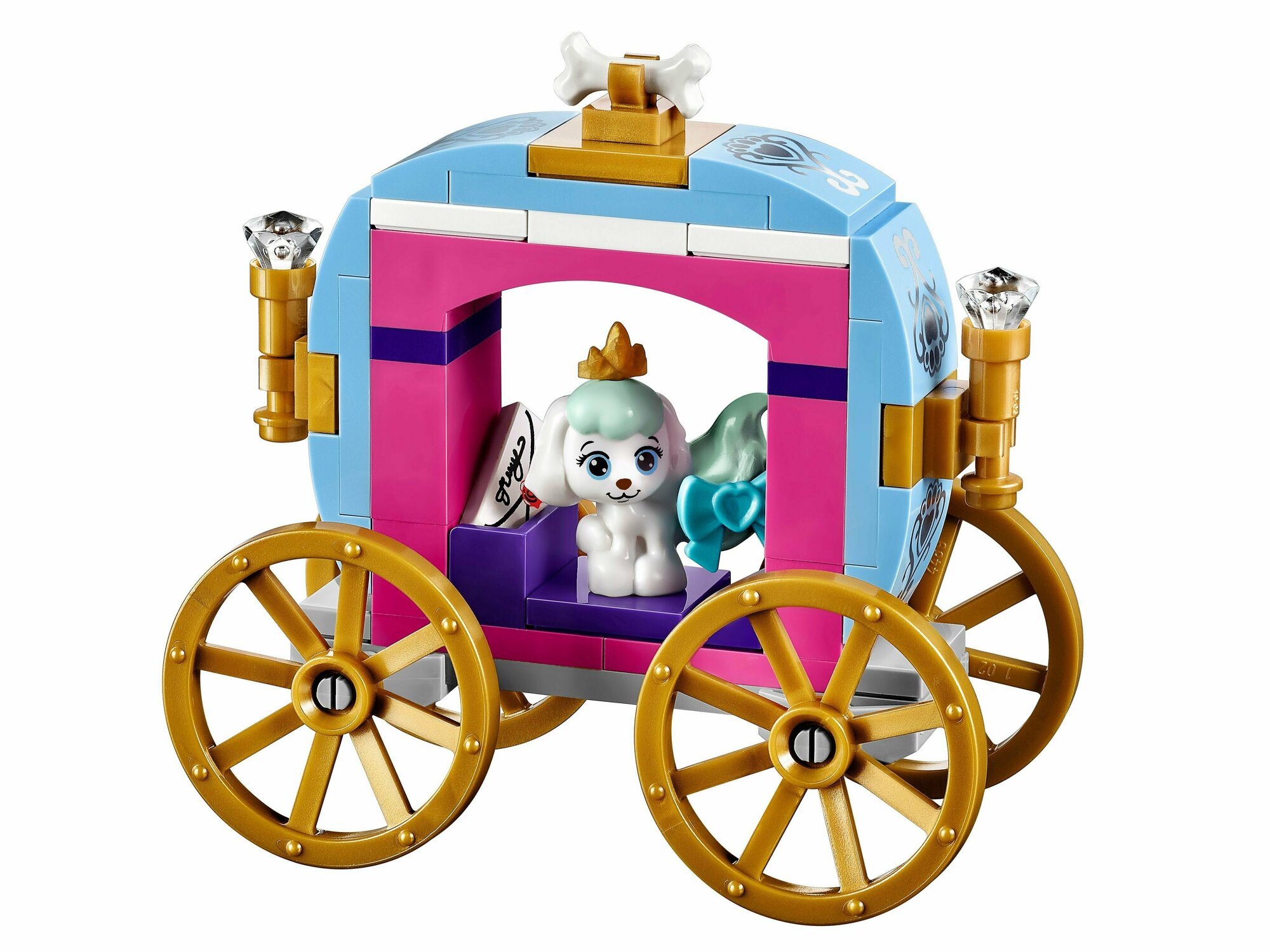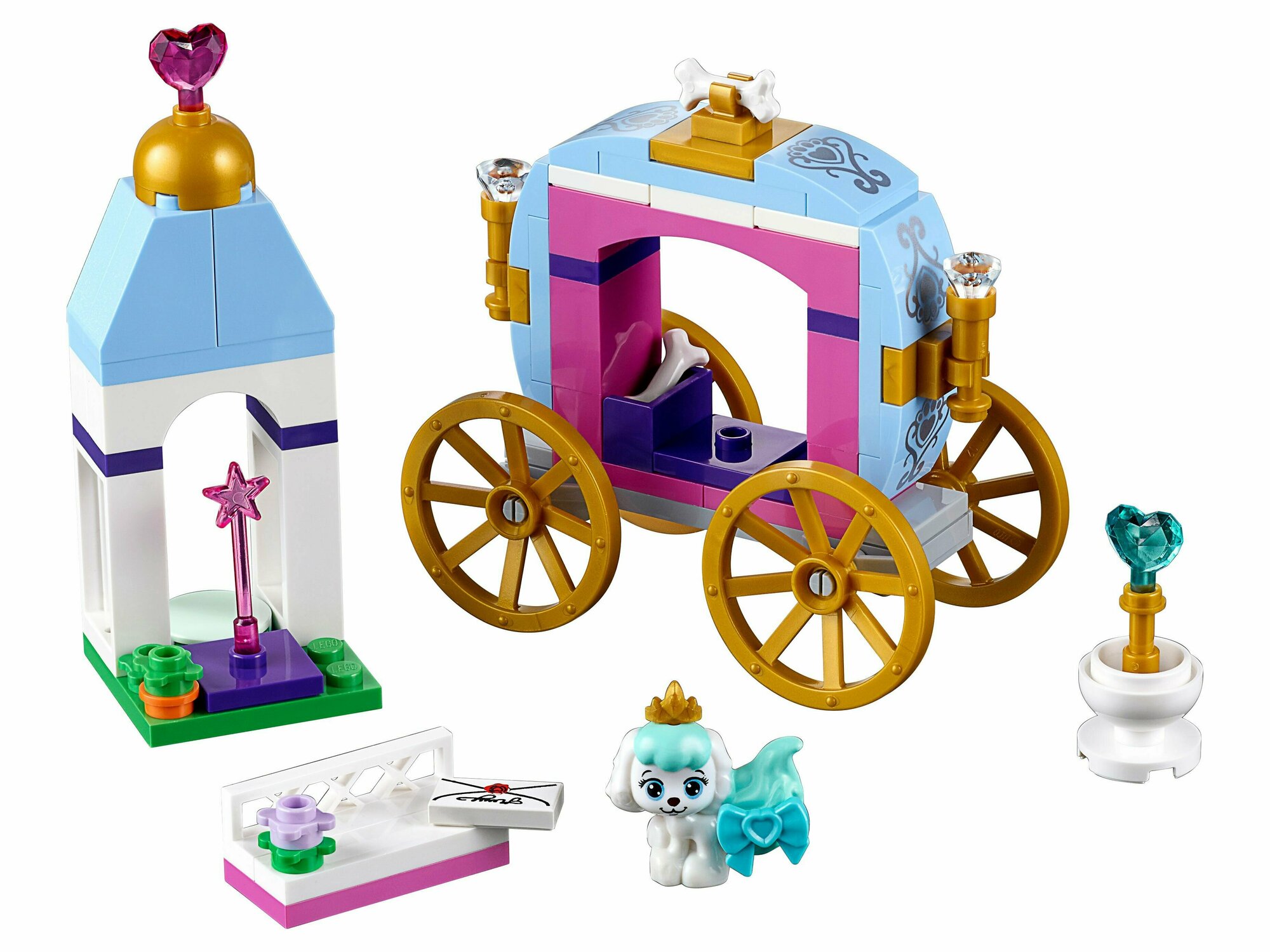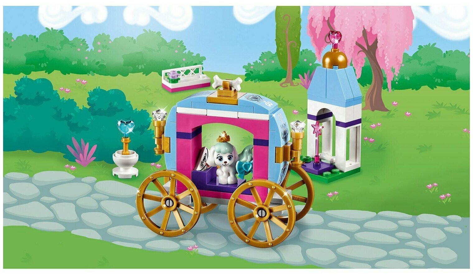 Игровой набор LEGO Disney Princess - отличный способ воссоздать самые яркие эпизоды из всеми любимых волшебных диснеевских мультфильмов. Изящная любимица Золушки - собачка Тыковка - обладает поистине благородными манерами: не бегает по двору за соседскими кошками, а в качестве транспорта для прогулок предпочитает карету, в которой имеют права ездить особо важные персоны. Хозяйка обожает свою собачку и позволяет ей такие роскошные путешествия, особенно когда фея-крестная забывает в замке волшебную палочку. Из деталей набора ты сможешь самостоятельно собрать королевскую карету с позолоченными колесами, голубым декорированным кузовом и изысканным интерьером в розово-фиолетовых тонах, а также беседку с лавочкой, фонтаном и постаментом для волшебной палочки. Комплект совместим с другими конструкторами серии Disney Princess.
