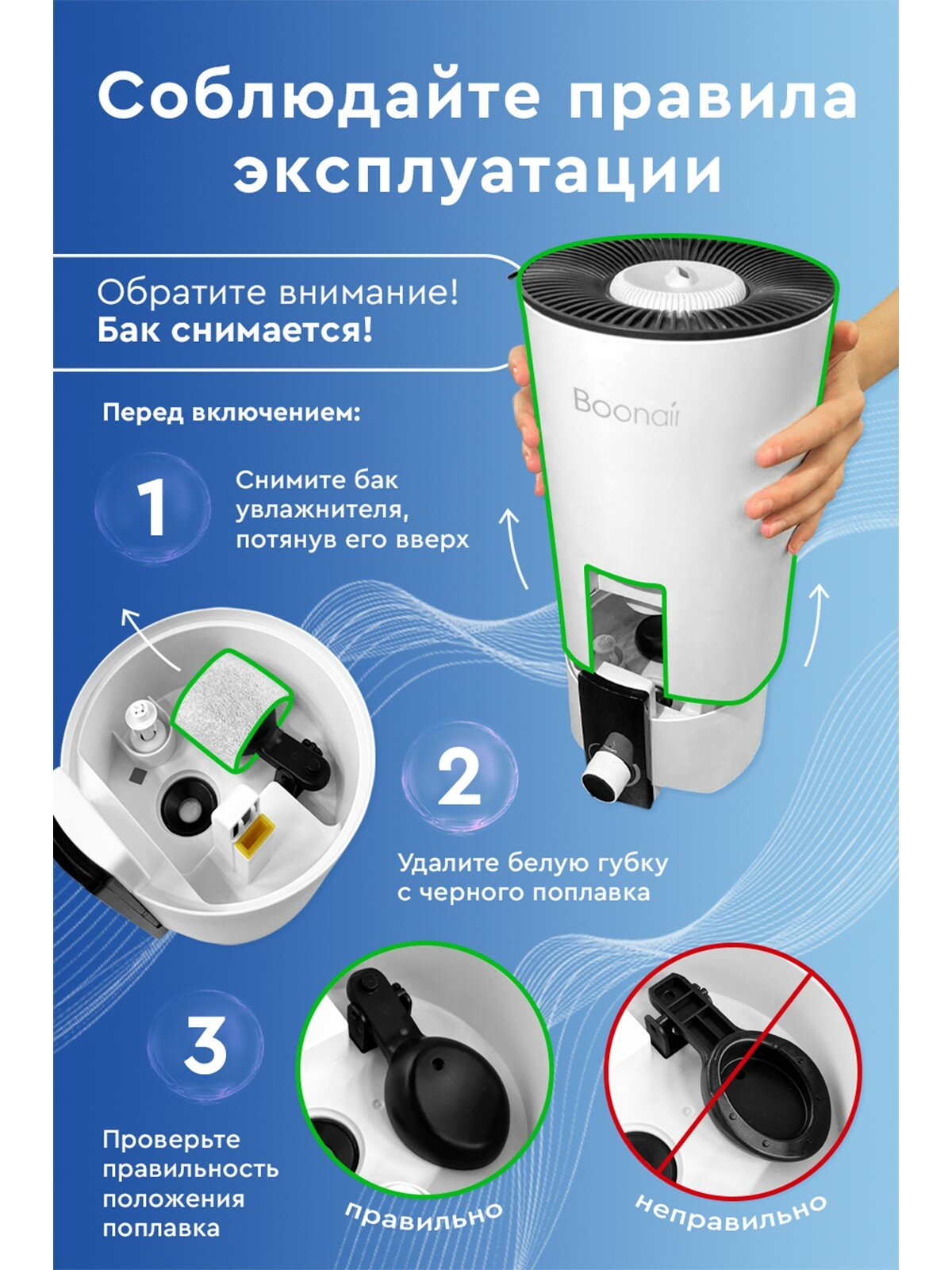 **Увлажнитель воздуха Boonair ** подходит для обработки площади 30 м². Используется для увлажнения воздуха, задерживания пыли в квартире, офисе, общественных учреждениях. Управление механическое. Благодаря небольшому весу 1,44 кг легко переносится с места на место. Габариты — 18,5 х 31,5 х 18,5 см. Имеет одну скорость работы. Производительность устройства в сутки составляет 7,2 л.