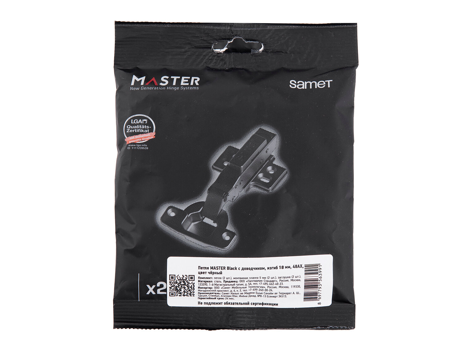 **Петля вкладная Samet Master Black** предназначена для установки на мебельные дверцы. Отличается простотой монтажа за счет подготовленных отверстий для крепежа на планках. Оснащена доводчиком, обеспечивающим плавность закрывания.