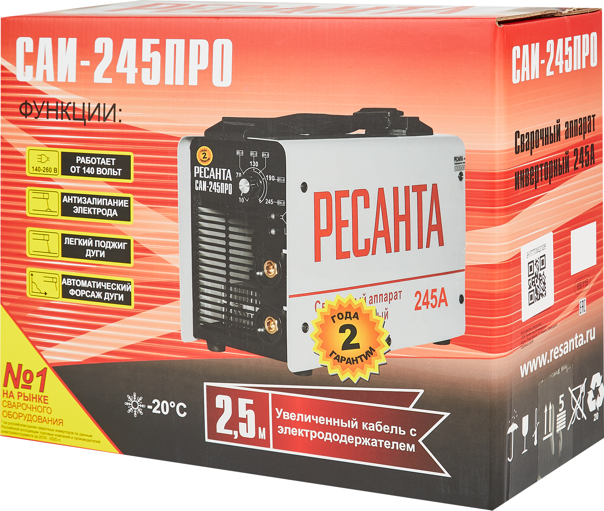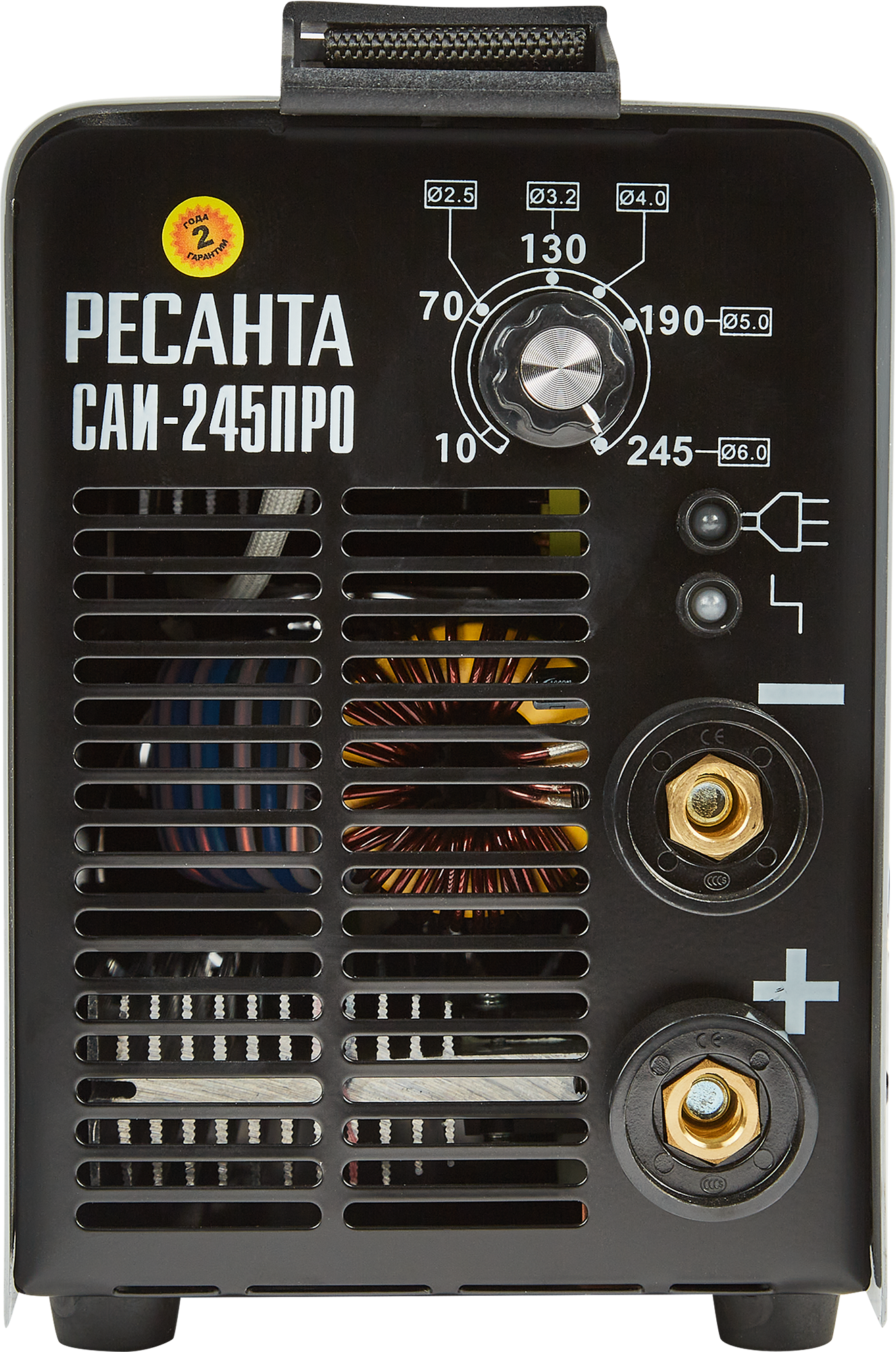 **Сварочный аппарат инверторный Ресанта ** предназначен для соединения краев изделий из металла. Формирует ровный и прочный шов. Применяется для наплавки при восстановлении формы деформированного изделия. В комплекте с устройством поставляются кабель сварочный и с электрододержателем. Оснащен функцией антизалипания и форсажа дуги. Защищен от попадания пыли и влаги по классу IP21, перегрева во время работы. Диапазон напряжения — 140-260 В.