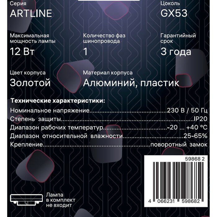 На сегодняшний день товар «Трековый светильник спот поворотный Ritter Artline 85x80мм под лампу GX53 до 4м² металл/пластик цвет золото Artline 59868 2» можно купить с кешбеком в 1 магазине: Яндекс.Маркет