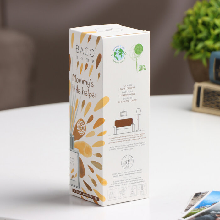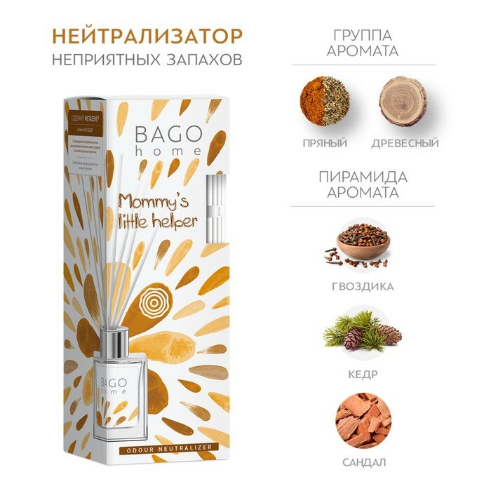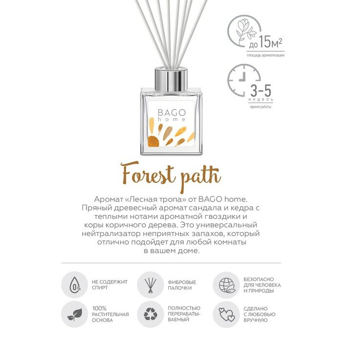 **Ароматический диффузор Bago Home Лесная тропа 45 мл** – Пряный древесный аромат сандала и кедра с теплыми нотами ароматной гвоздики и коры коричного дерева.