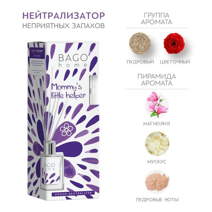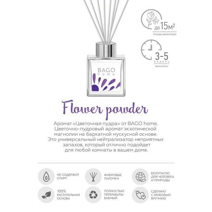 **Ароматический диффузор Bago Home Цветочная пудра 45 мл** – Цветочно-пудровый аромат экзотической магнолии на бархатной мускусной основе.
