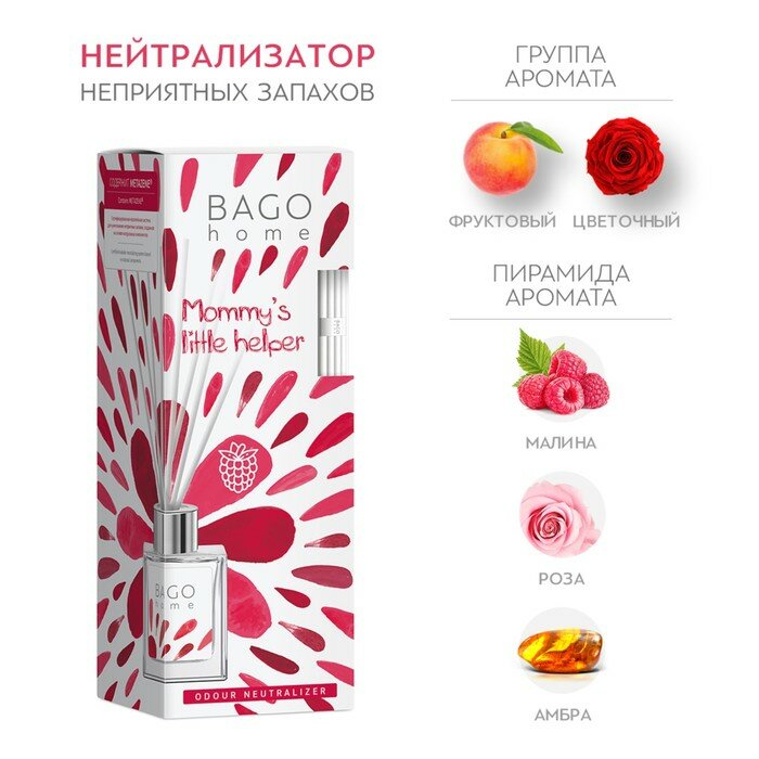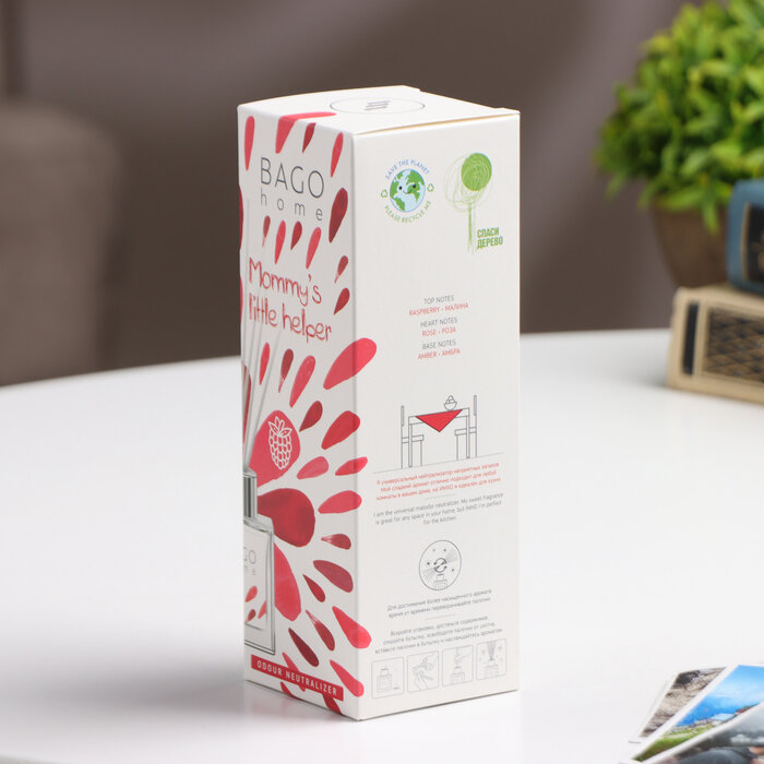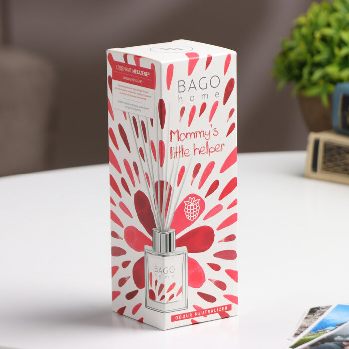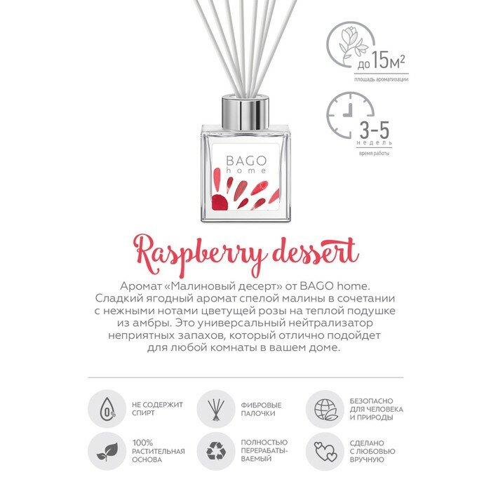 **Ароматический диффузор Bago Home Малиновый десерт 45 мл** – Сладкий ягодный аромат спелой малины в сочетании с нежными нотами цветущей розы на теплой подушке из амбры.