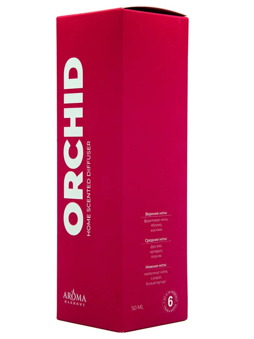 **Ароматический диффузор Aroma Harmony Orchid 50 мл** с палочками. Верхние ноты: Фруктовые ноты, яблоко, жасмин. Средние ноты: фрезия, орхидея, персик. Базовые ноты: молочные ноты, сандал, белый мускус.
