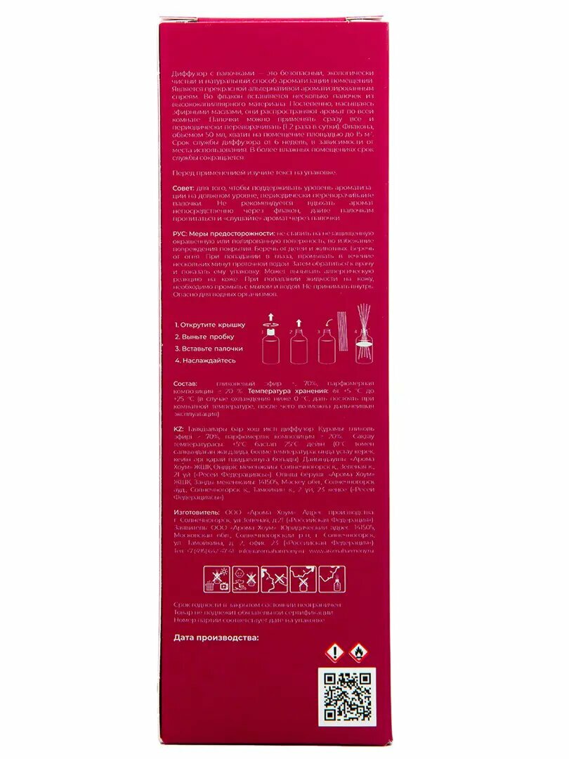 Откройте упаковку, достаньте флакон и палочки. Открутите крышку, вставьте палочки во флакон. Интенсивность аромата можно регулировать количеством палочек. Чем их больше, тем интенсивнее аромат. В более влажных помещениях и на сквозняках срок службы диффузора сокращается.