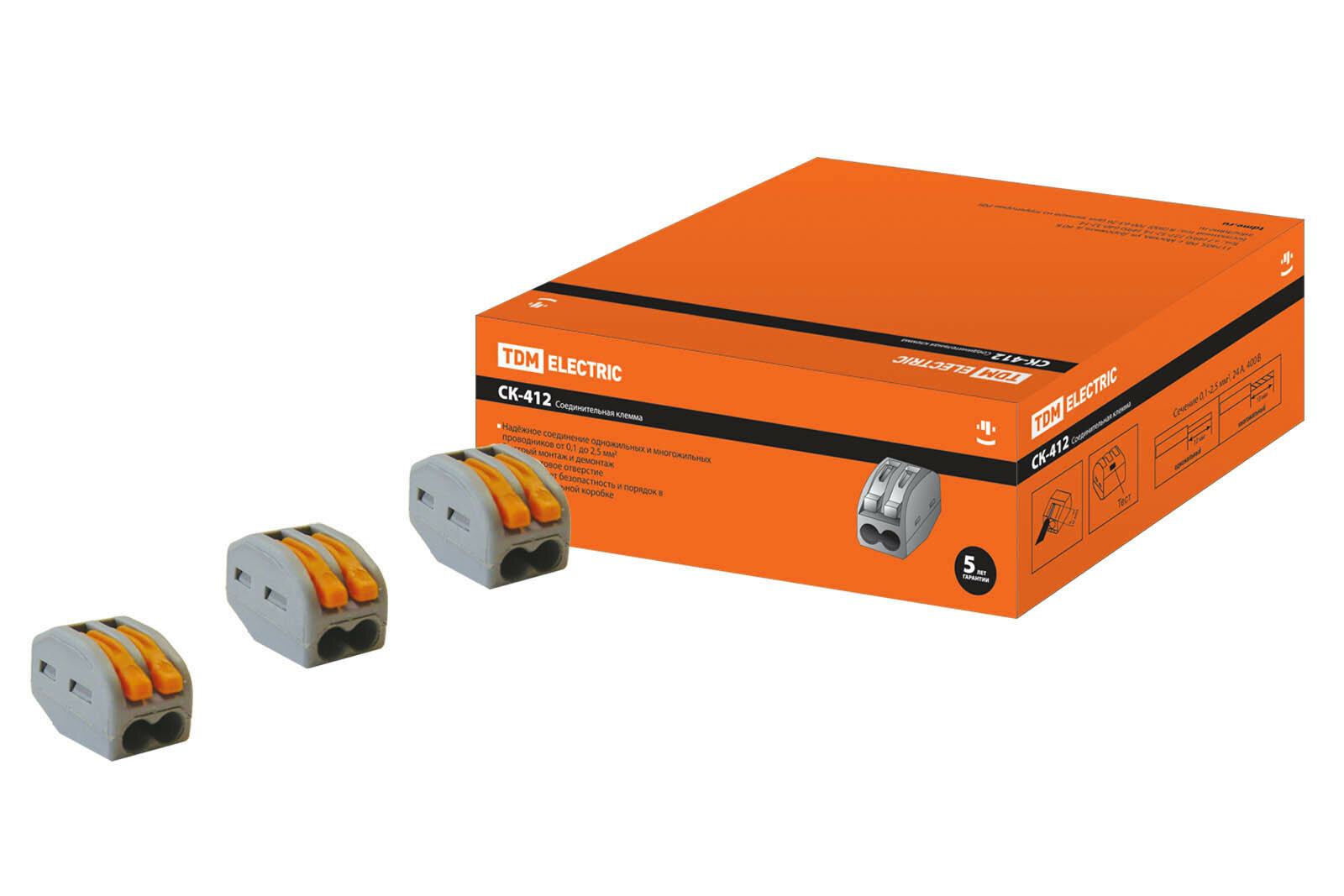 **Клемма соединительная TDM ** оснащена рычажком, подойдет для соединения двух проводов (одно- и двухжильных) с сечением от 0,08 до 2,5 мм² безвинтовым способом. За счет пластикового корпуса обеспечивается изоляция проводников, рычажки надежно зажимают провода.