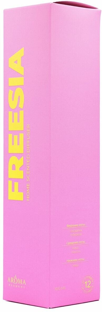 **Ароматический диффузор Aroma Harmony Freesia 100 мл** — цветочный аромат. Неординарный и очень дорогой аромат открывается с маслянистых нот загадочной туберозы, приправленной терпкой гвоздикой. В сердце парфюмерного букета трогательно переливаются фруктовые аккорды кокоса и сочного сладкого персика. Чувственность и теплоту ароматному букету придают кедр и цветы фрезии. Верхние ноты: гвоздика, тубероза. Средние ноты: кокос, персик. Базовые ноты: кедр.