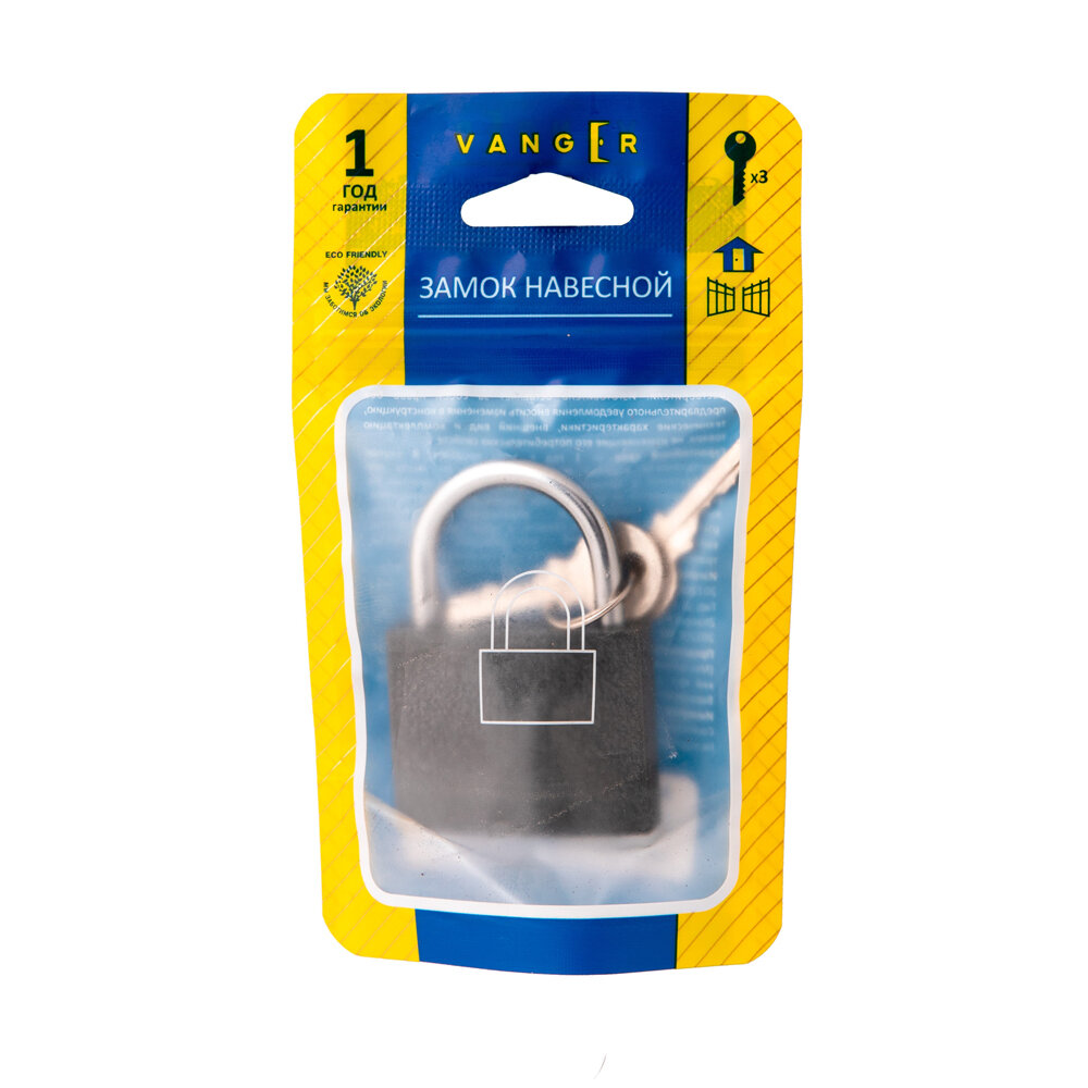 **Замок навесной Vanger ** выполнен из чугуна с антикоррозийным напылением. Дужка изготовлена из хромированной стали. Предназначен для использования снаружи и внутри помещений. Может применяться для запирания ворот, калиток, рольставней, в которых есть проушины.