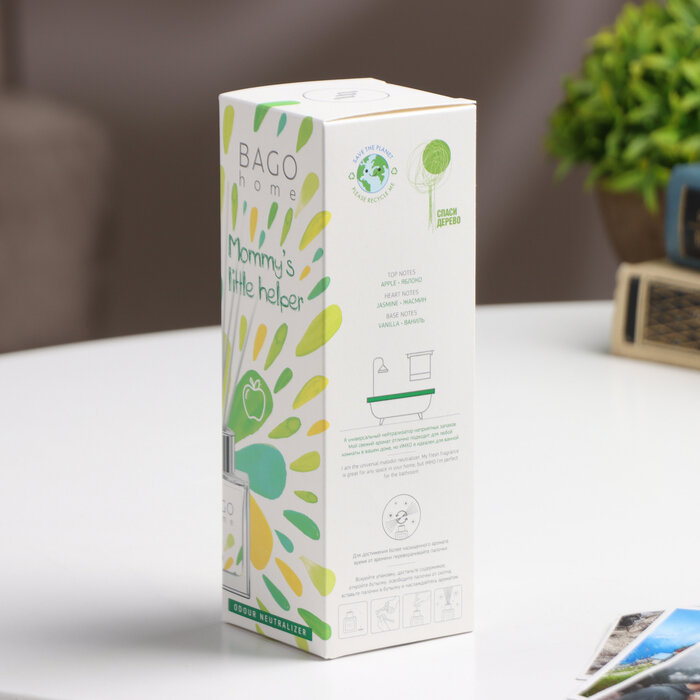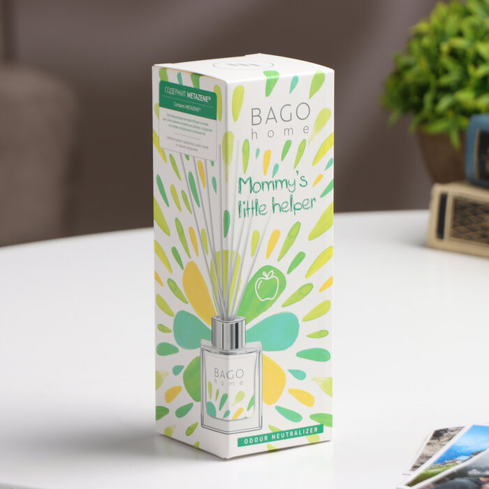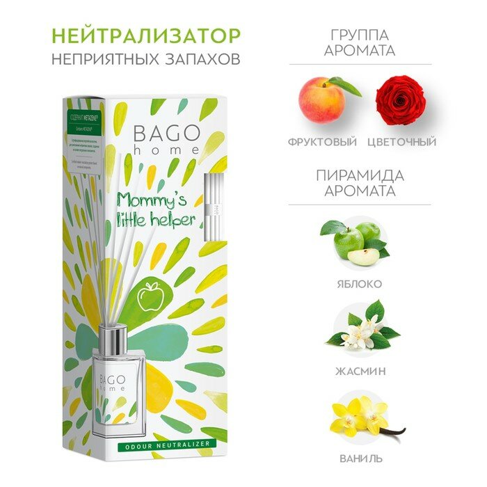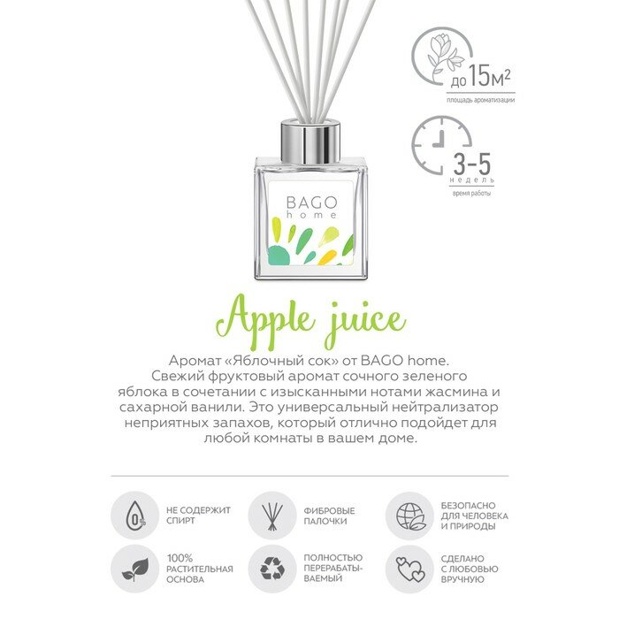 **Ароматический диффузор Bago Home Яблочный сок 45 мл** – Свежий фруктовый аромат сочного зеленого яблока в сочетании с изысканными нотами жасмина и сахарной ванили.