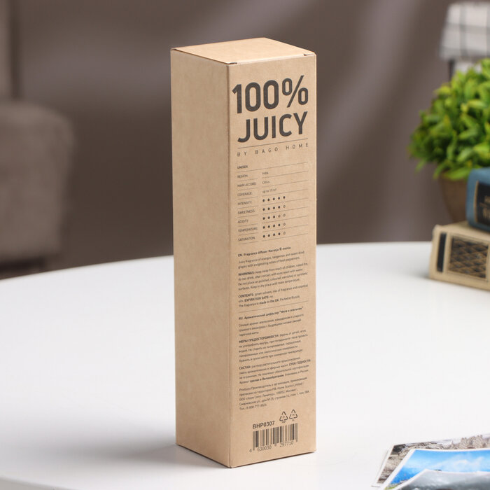 | Особенности | Ароматический диффузор "Мята и апельсин" от BAGO home осыпает цитрусовыми брызгами. Открываясь мятной свежестью в верхнем ярусе, композиция погружается в цитрусовую сладость спелого апельсина в сердце пирамиды. Финальный аккорд звучит терпкой нотой винного винограда в нижнем ярусе. |