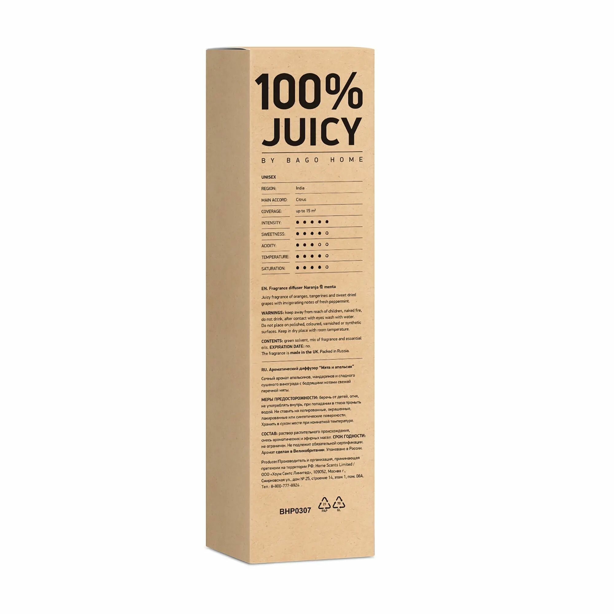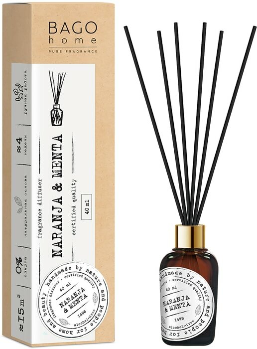 **Ароматический диффузор Bago Home Мята и апельсин 400 мл** – Сочный аромат ярких апельсинов, оранжево-красных мандаринов и сладкого сушеного винограда в сочетании с бодрящими зелеными нотами свежей перечной мяты.