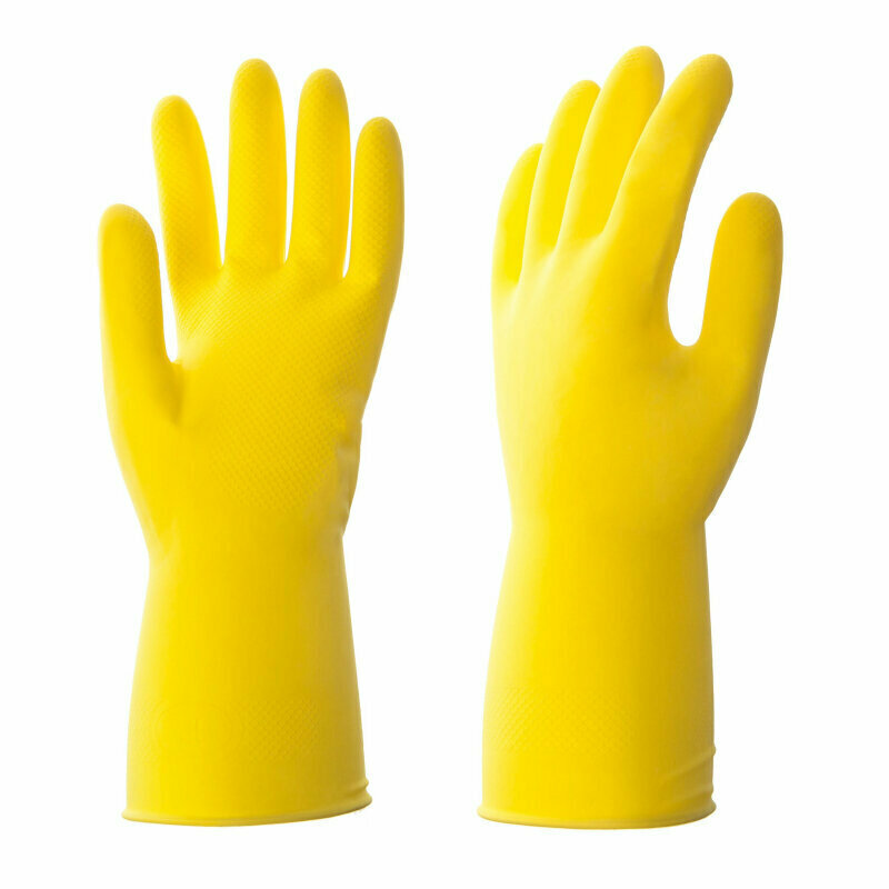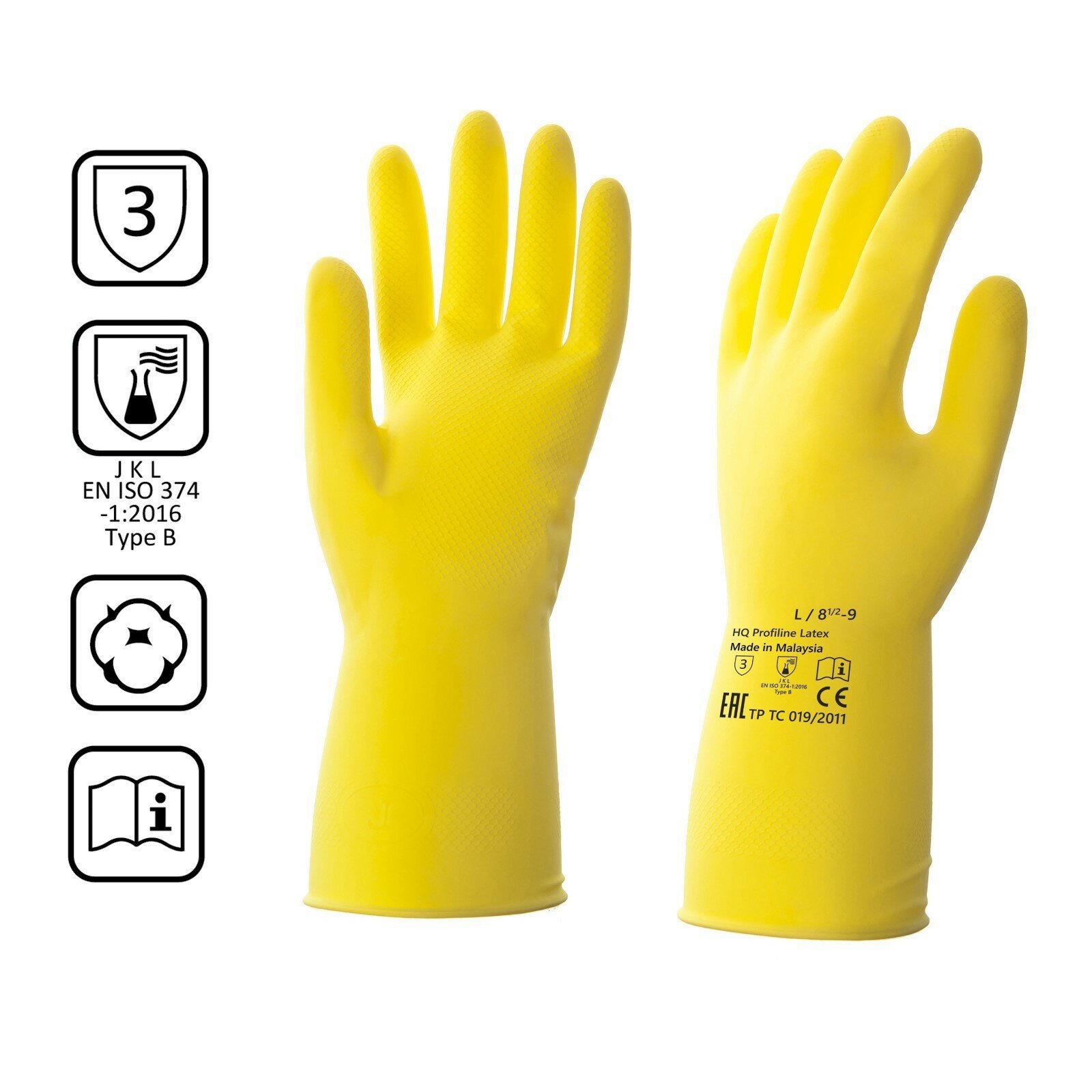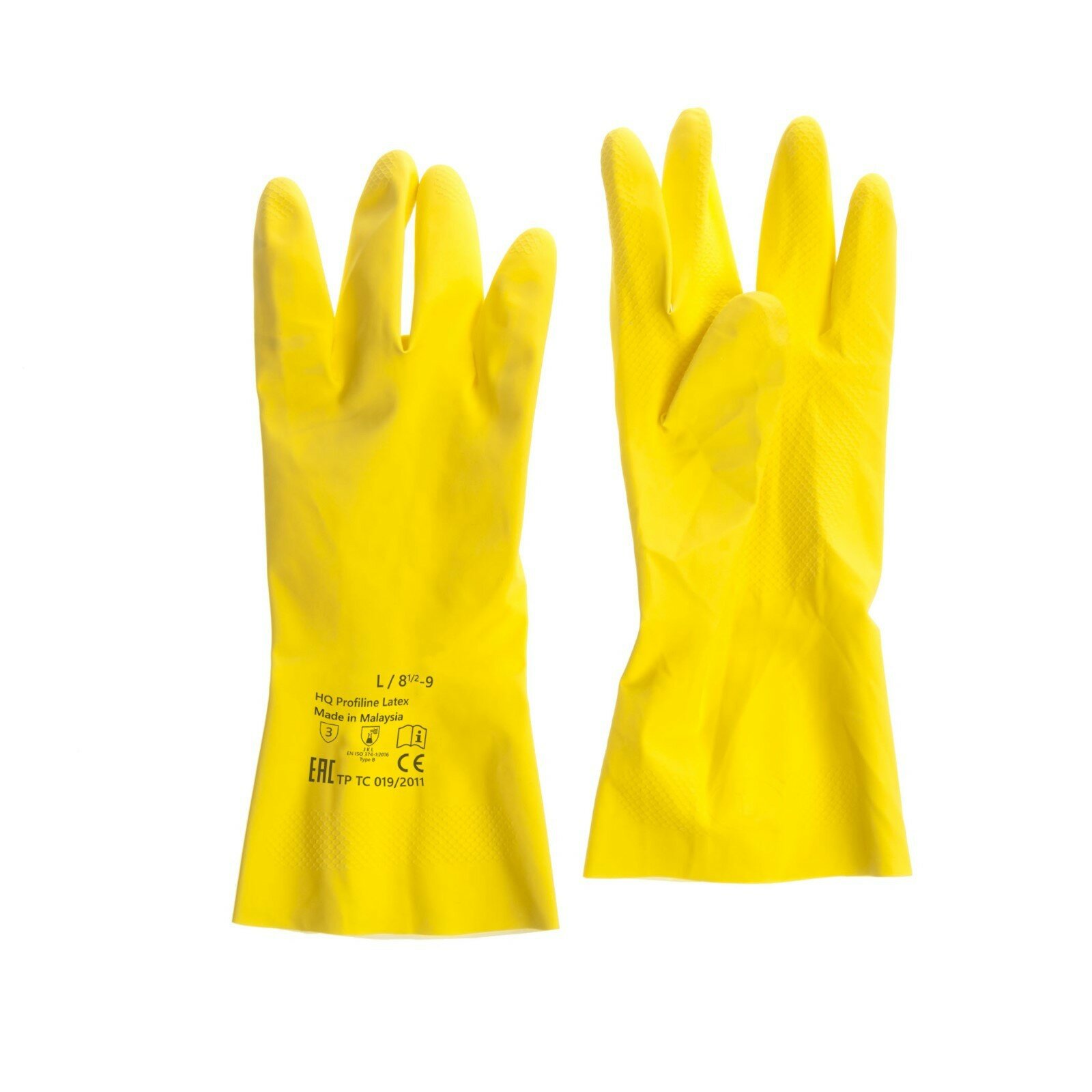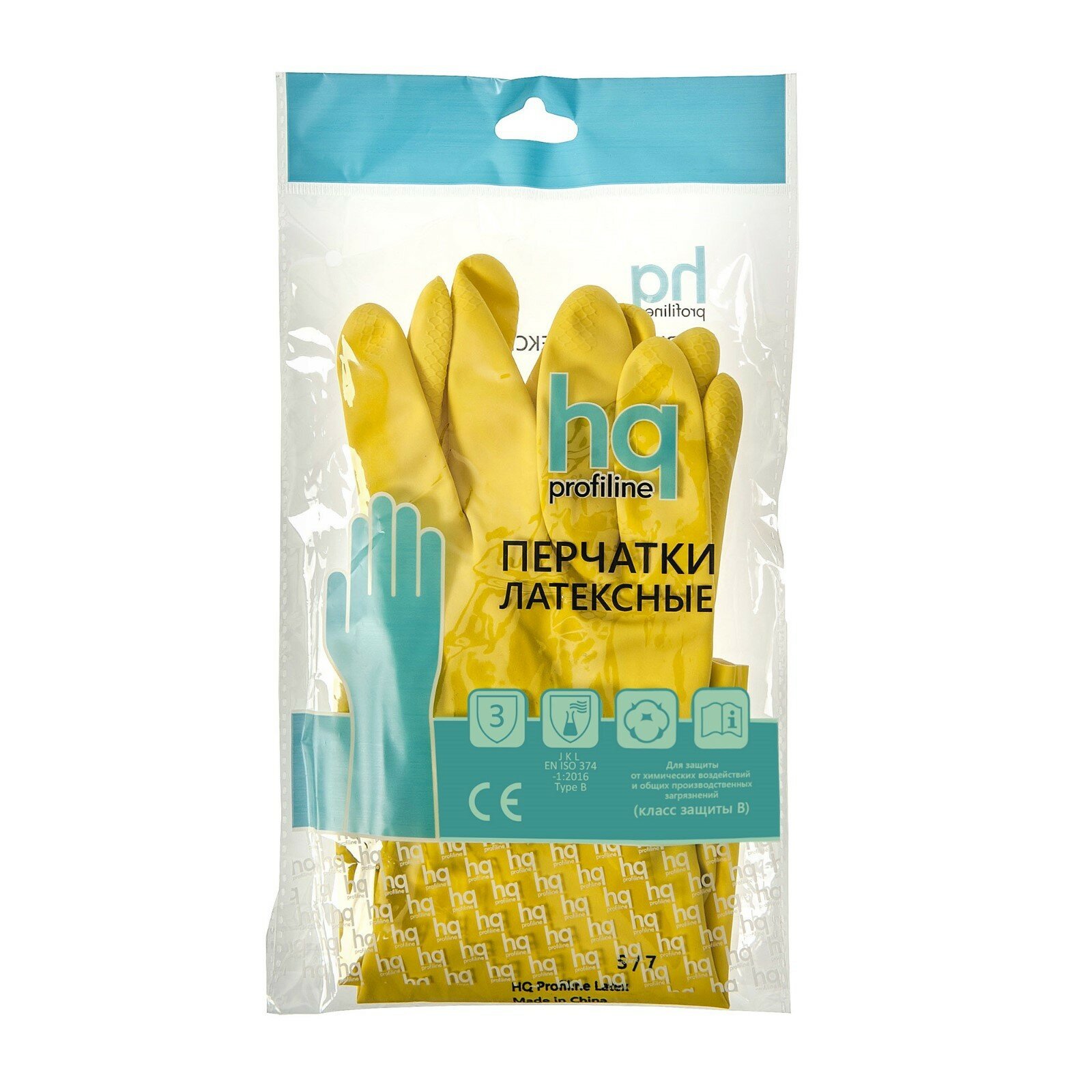 **Перчатки латексные Profiline HQ** с хлопковым внутренним напылением. Размер — 7/S. Изделия устойчивы к химическим средствам, обеспечивают надежный хват. В наборе поставляются две перчатки. На упаковке размещена инструкция по определению размера руки.