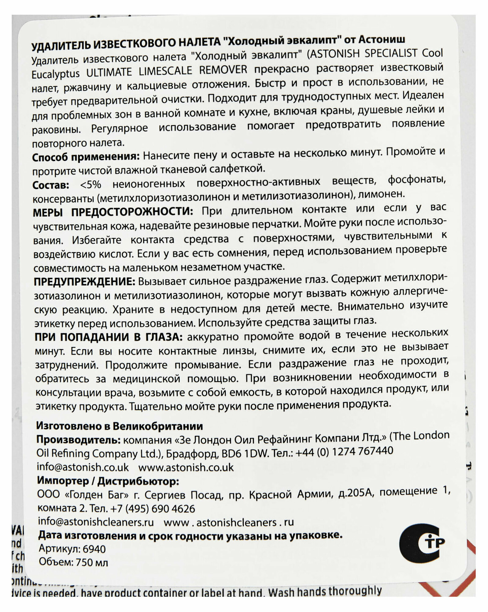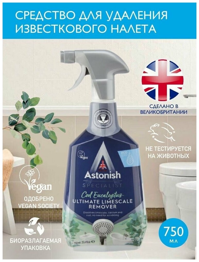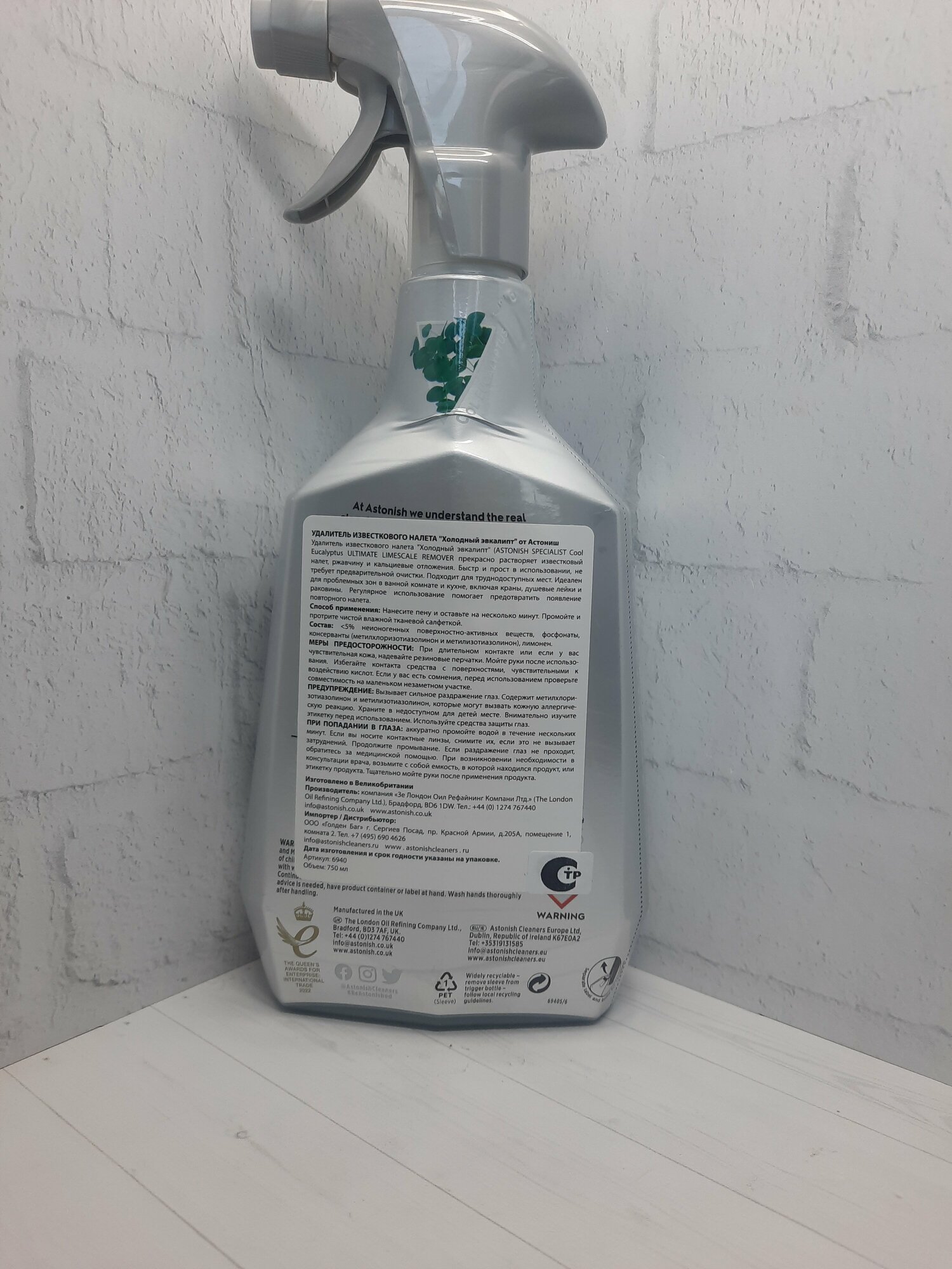 **Средство для удаления известкового налета Astonish** предназначено для очистки поверхностей в ванной комнате, санузле — унитаза, раковины, душевой кабины, смесителей. Справляется с новыми и въевшимися пятнами. Бутыль оснащена курком и пульверизатором, позволяющими контролировать объем распыленной жидкости и обеспечивает точность нанесения.