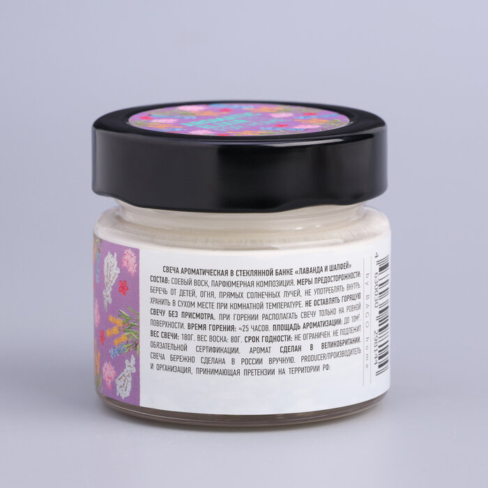 **Свеча ароматизированная Лаванда и шалфей** предназначена для декорирования помещения, создания романтической обстановки. Придает воздуху приятный аромат. Сделана из воска. Упакована в стеклянную банку. Может служить дополнительным источником света.