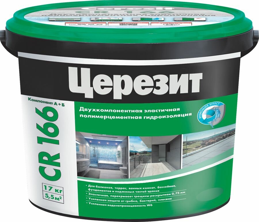 Двухкомпонентная масса Ceresit CR 166 — это инновационное решение для жидкой гидроизоляции. Ее можно использовать в различных сферах: • для гидроизоляции фундаментов, гидротехнических сооружений, террас, балконов, элементов зданий, находящихся ниже уровня земли и т.п.;• для гидроизоляции ванн, открытых и крытых бассейнов и резервуаров для воды хозяйственно-питьевого назначения глубиной до 50 м;• в качестве финишного покрытия для защиты от коррозии бетонных и железобетонных сооружений: балконных плит, опор, подпорных стен, градирен, мостов и т.д. Благодаря удобству применения, мастика для гидроизоляции подходит для всех типов поверхностей, включая бетон и железобетон.Это идеальное средство для тех, кто ищет надежную защиту от влаги и агрессивных веществ. Цементная гидроизоляция сочетает в себе эластичность и прочность. Она устойчива к солевой и щелочной агрессии. Укладка плитки возможна через 12 часов. Это удобно при ремонте ванной под плитку или пола.полимерно-цементная гидроизоляция также пригодна для наружных и внутренних работ. Она обеспечивает превосходную адгезию и легко наносится шпателем, кистью или механизированным способом. Кроме того, данное средство морозостойкое и может быть использовано в условиях низких температур без потери свойств.Продукт идеально подходит для контакта с питьевой водой. совместима с гидроизоляционной лентой Церезит CL152.Гидроизоляция обеспечивает высокую степень защиты благодаря своим уникальным свойствам. При нанесении на бетонные поверхности она создает барьер против воды, что делает ее незаменимой для ванной комнаты или фундамента дома.Обмазочная техника нанесения сохраняет свои свойства при различных погодных условиях. Это делает продукт универсальным решением для любой строительной задачи связанной с водозащитой конструкций.CR 166 поставляется в двух вариантах упаковки: Компонент А + Компонент В: Комбо-ведро, содержащее Компонент А (2 фольгированных мешка по 6 кг) и Компонент В (1 канистра 4 л).