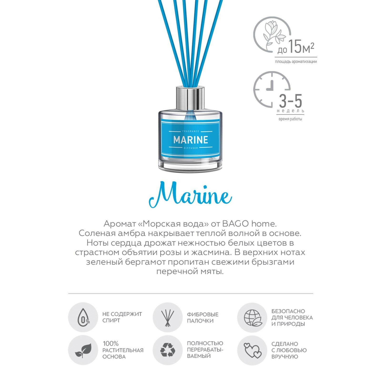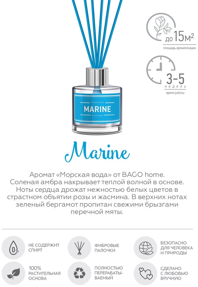 **Ароматический диффузор Bago Home Морская вода 40 мл** – Соленая амбра накрывает теплой волной в основе. Ноты сердца дрожат нежностью белых цветов в страстном объятии розы и жасмина. В верхних нотах зеленый бергамот пропитан свежими брызгами перечной мяты.
