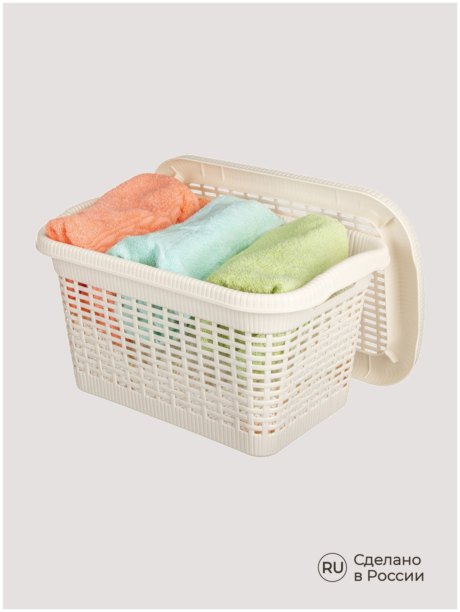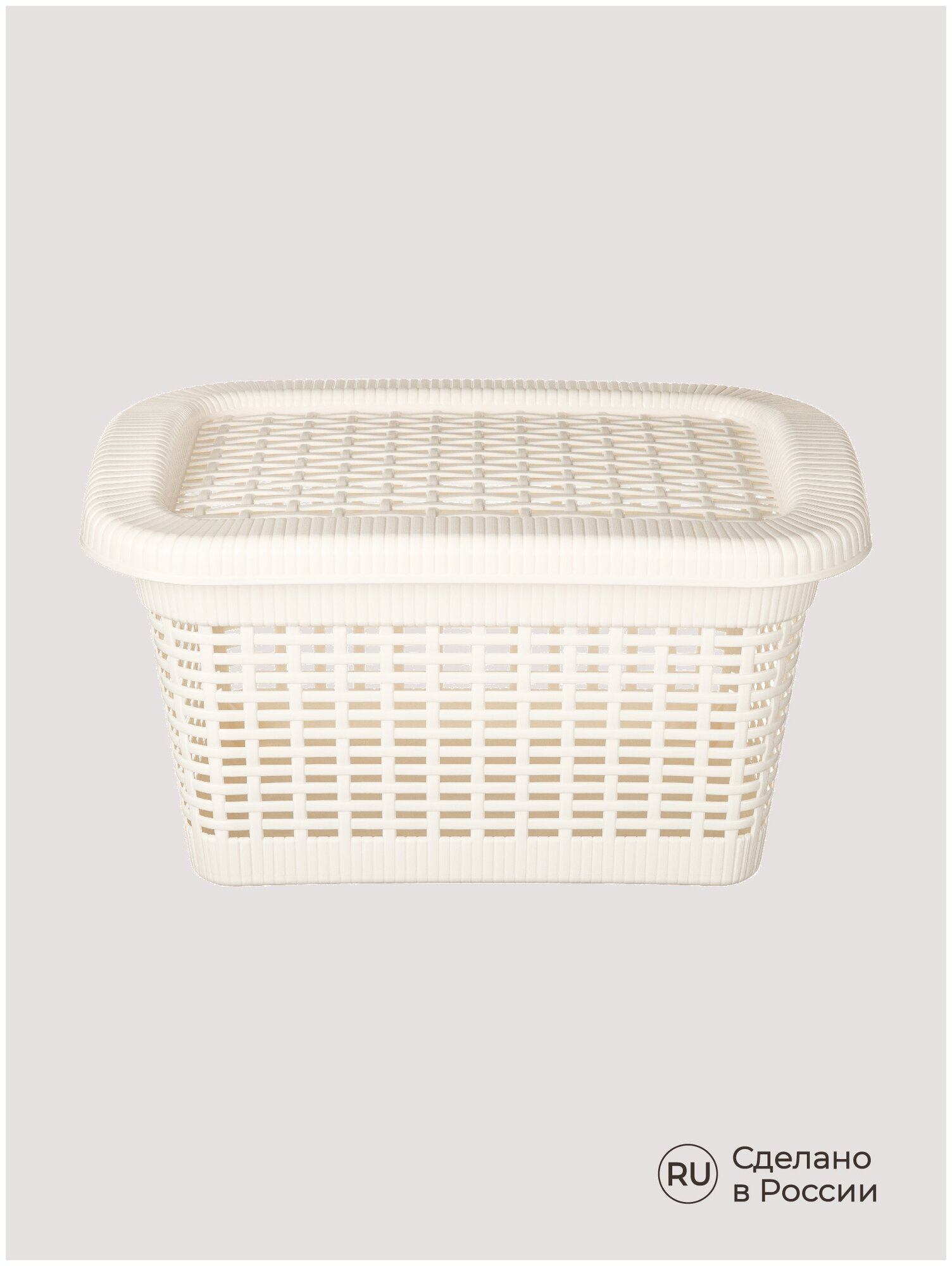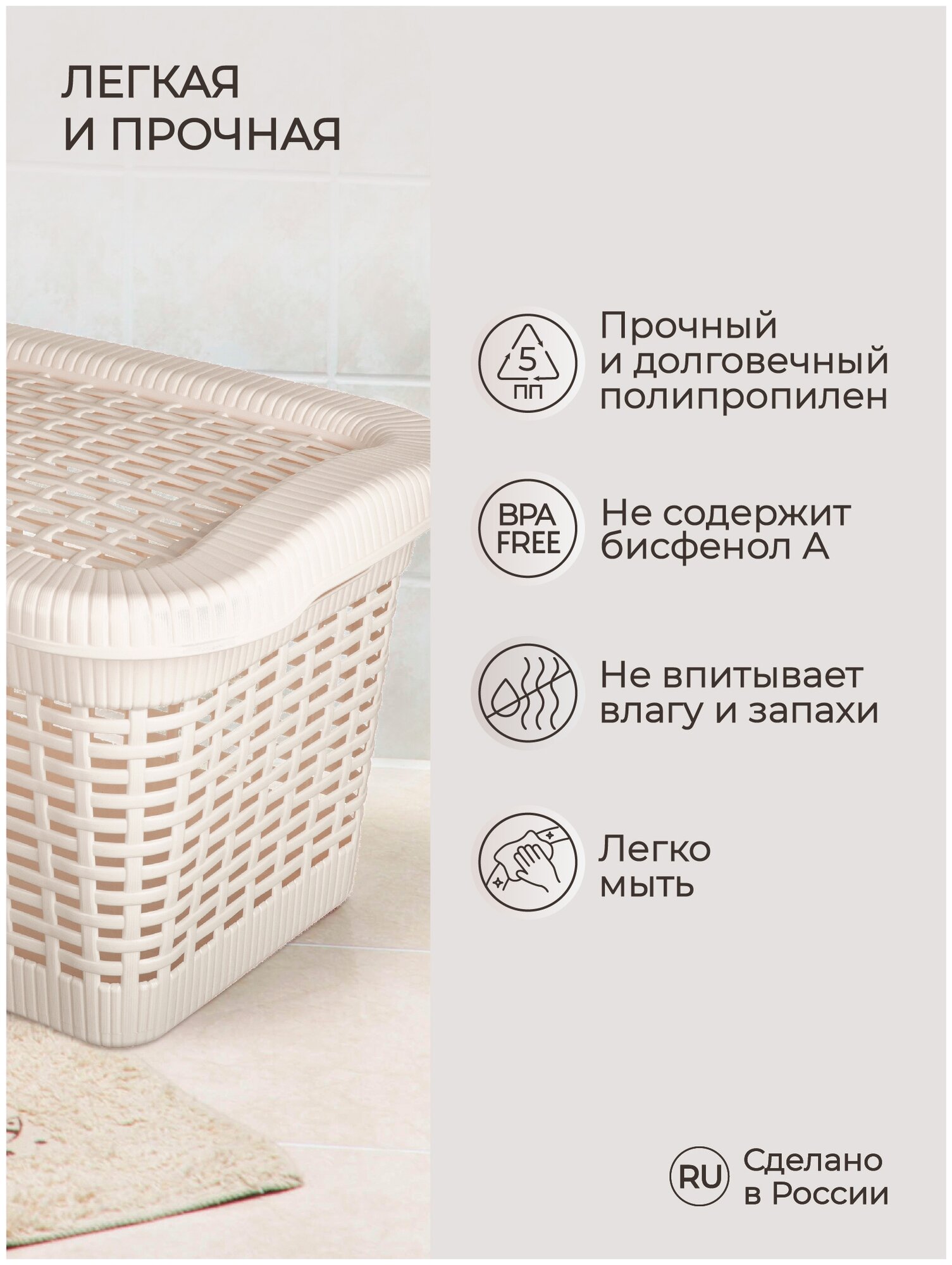 Корзина для белья, стилизованная под натуральный ротанг, гармонично впишется в ванную комнату. Для удобства переноски по бокам корзины предусмотрены специальные отверстия. Крышка скрывает содержимое корзины от посторонних глаз, а также может служить дополнительным местом для хранения легких туалетных принадлежностей. Корзина изготавливается из прочного и долговечного полипропилена, отвечающего требованиям влажного помещения. Естественные нейтральные цвета и приятная фактура делают корзину эстетически привлекательным дополнением интерьера ванной комнаты.