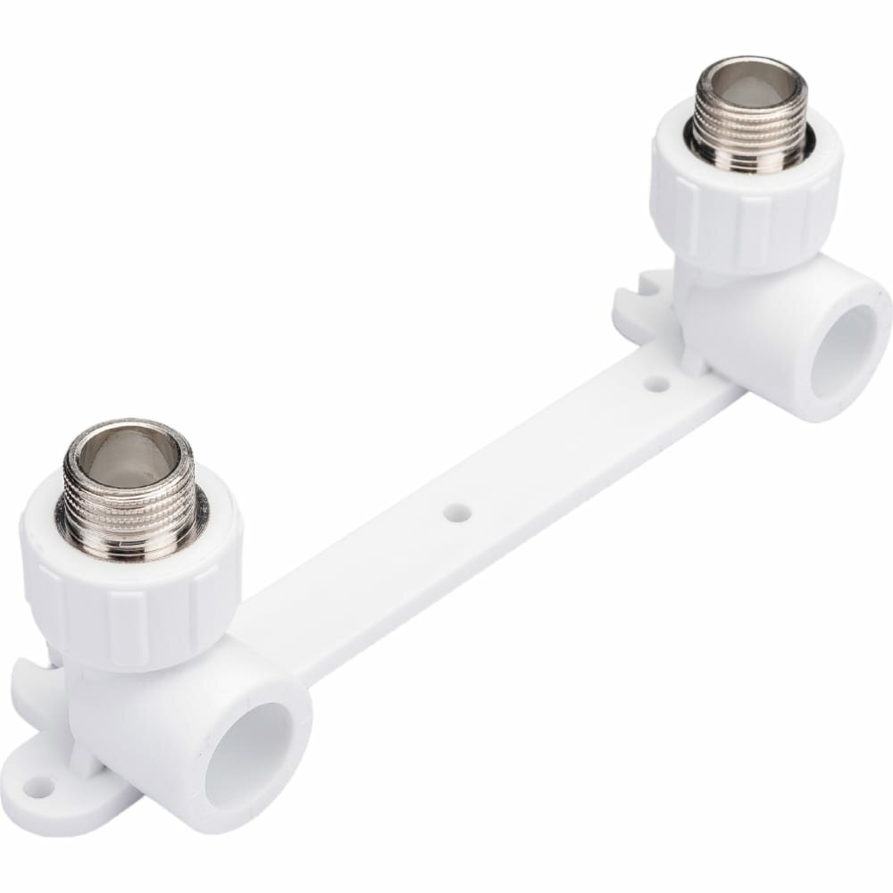 **Угольник двойной Политэк НР** предназначен для установки смесителей в системах горячего и холодного водоснабжения. Крепится к вертикальной поверхности. Корпус изготовлен из полипропилена, устойчивого к перепадам температуры, влаги и химически агрессивной среды. Латунные закладные детали не ржавеют. Изготавливается из тех же материалов, что и трубы, поэтому обеспечивает полную совместимость соединений.